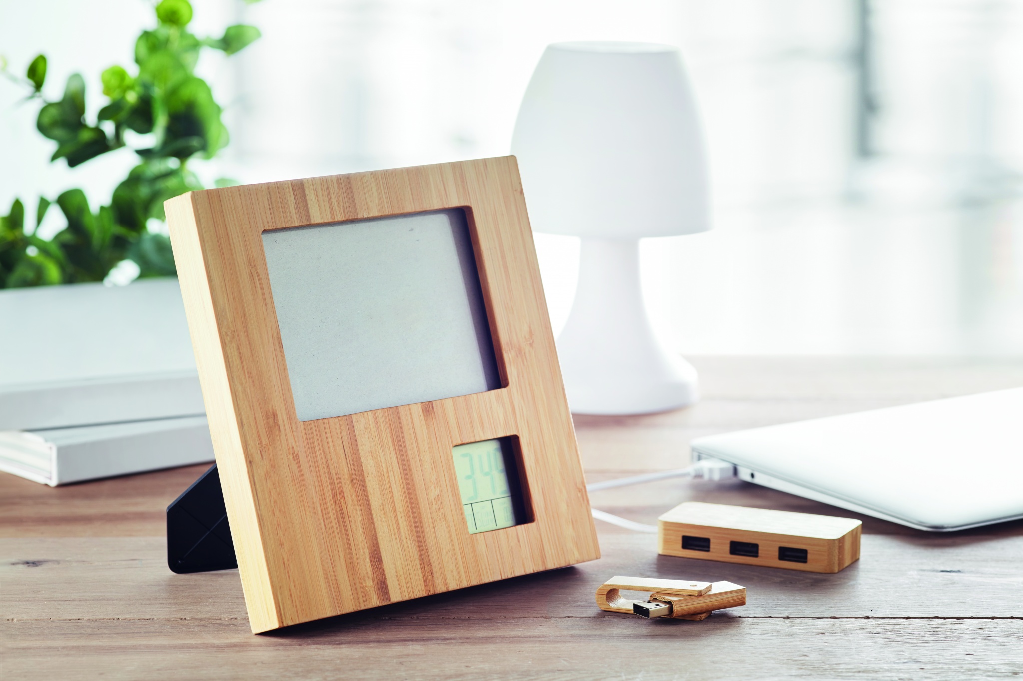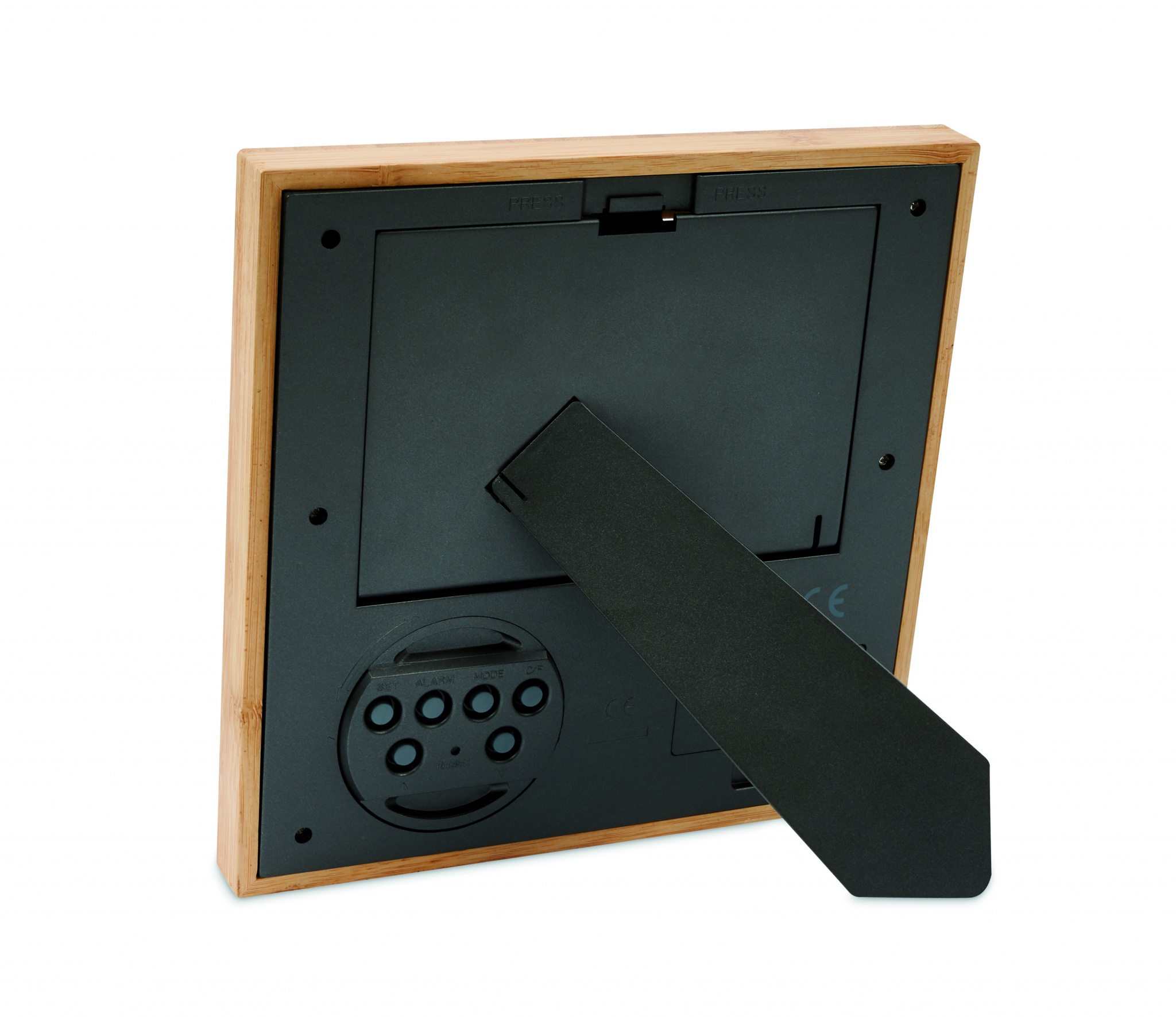 Photo frame in bamboo with weather station. Displays time, date and temperature. Alarm function and count down timer. 2 AAA batteries not included. Bamboo is a natural product, there may be slight variations in colour and size per item, which can affect the final decoration outcome.