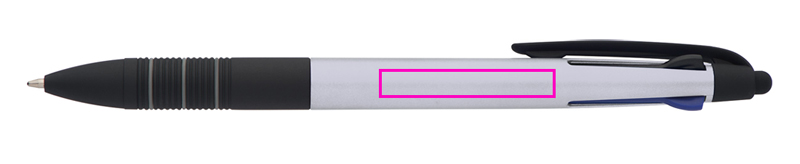 4in1 plastic ballpen with 3 different writing colors (blue, red and black) + touch function and rubberized grip zone. We print your logo on the shaft.