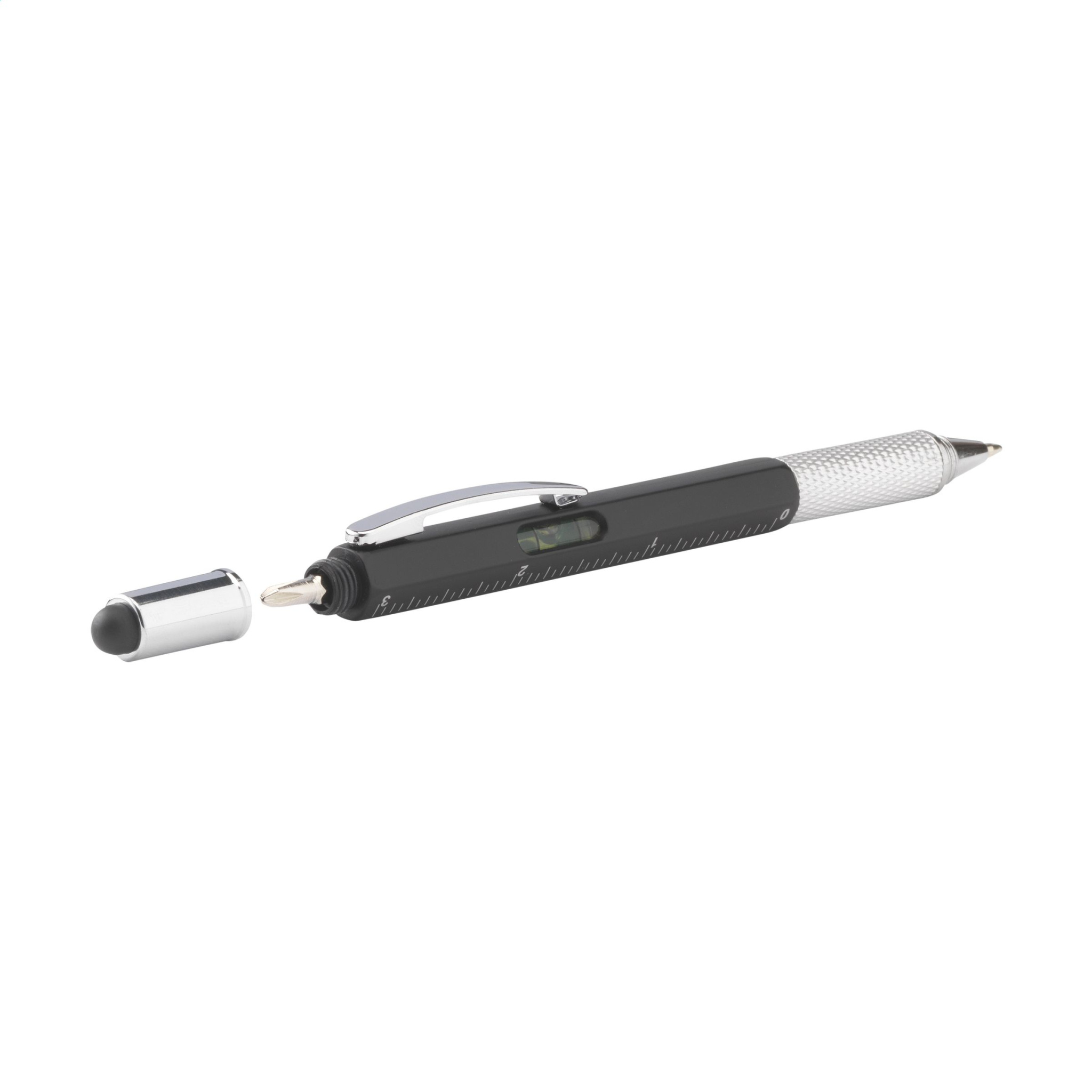 Multifunctional ballpoint pen made from ABS material. With ruler (7 cm/3 inches), spirit level, screwdriver and stylus function. The pen has blue ink, a metal clip and a twist mechanism.
