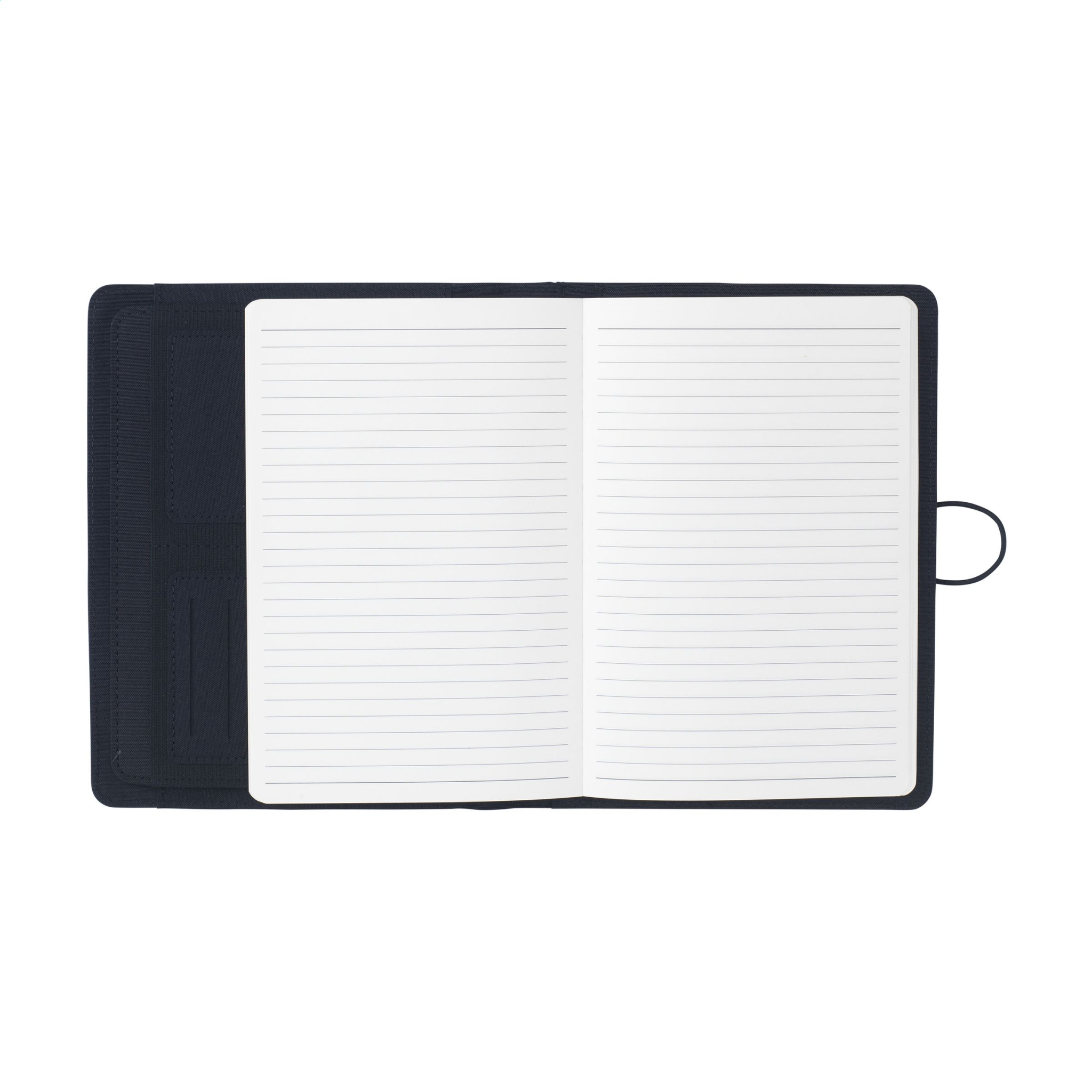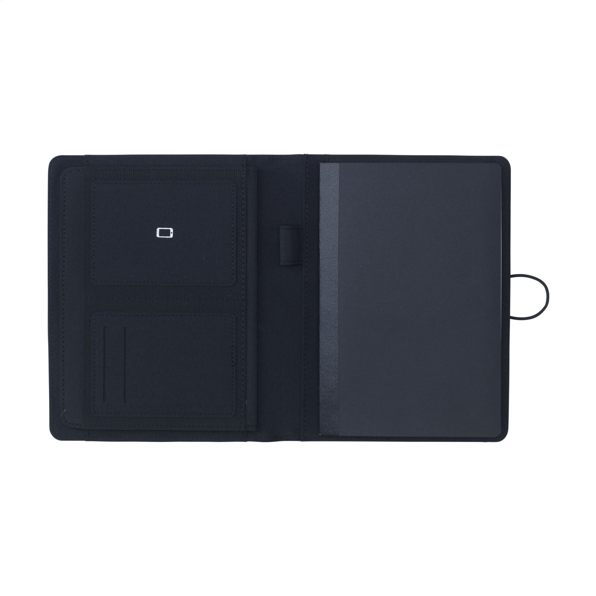 WoW! Modern A5 conference/document folder made from RPET material. Equipped with various insert pockets, including a separate compartment for storing a mobile phone, two compartments for cards and a loop for attaching a pen. Includes notebook with approx. 64 sheets of FSC® certified, cream-coloured lined paper (70 g/m²).
