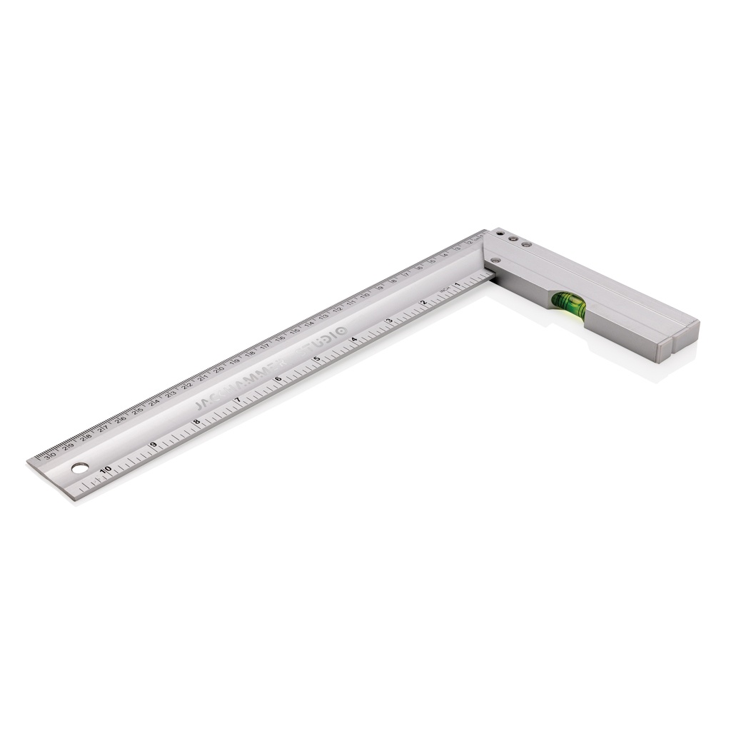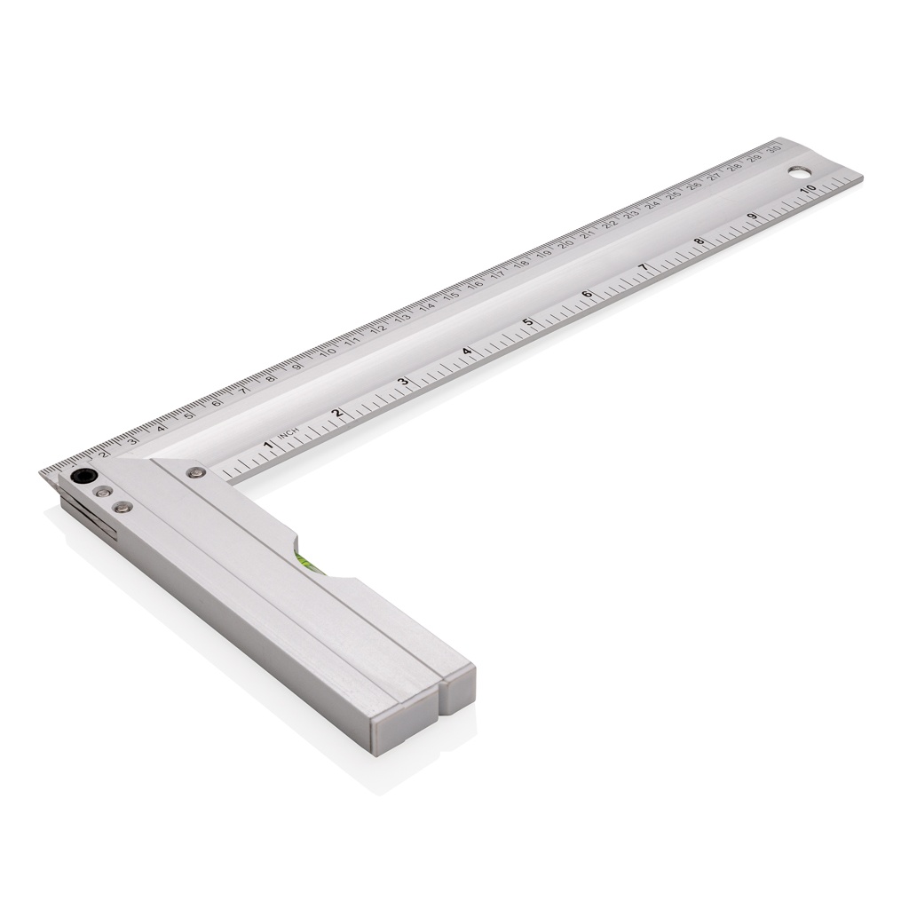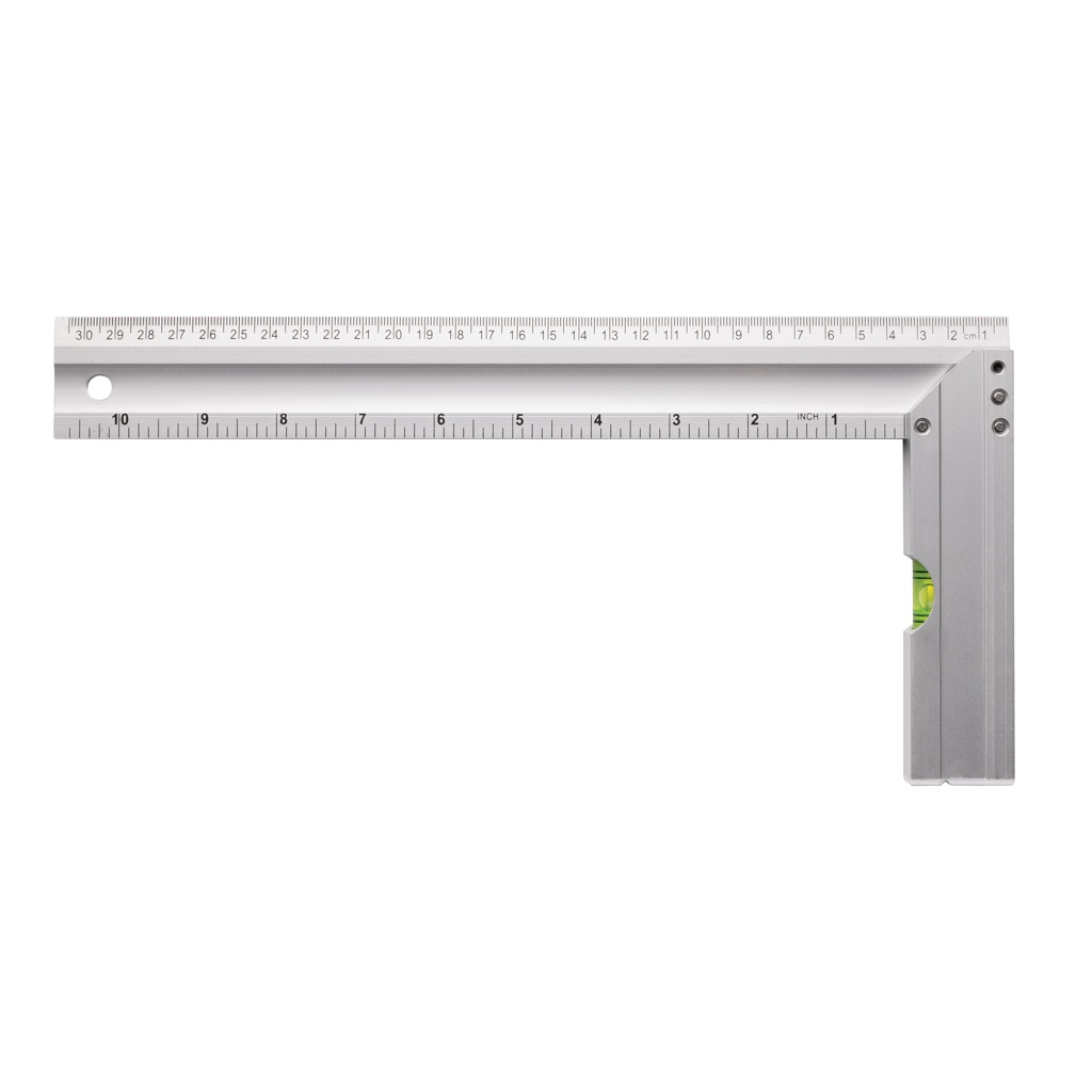 Professional aluminum square ruler with integrated level optimal to measure corners and draw squares. Double sided printing with indication in CM (30) and inches (10) Level Accuracy 0.5mm