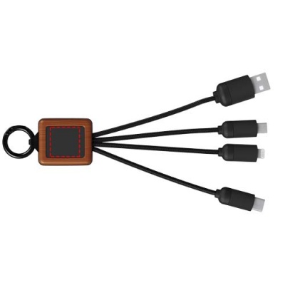 3-in-1 wooden cable with light-up logo and 3 connectors (Type-C/micro USB/iPhone), and cords made of Recycled PET plastic. The cable can charge up to 3 devices at the same time. Patent EUROPE EUIPO.