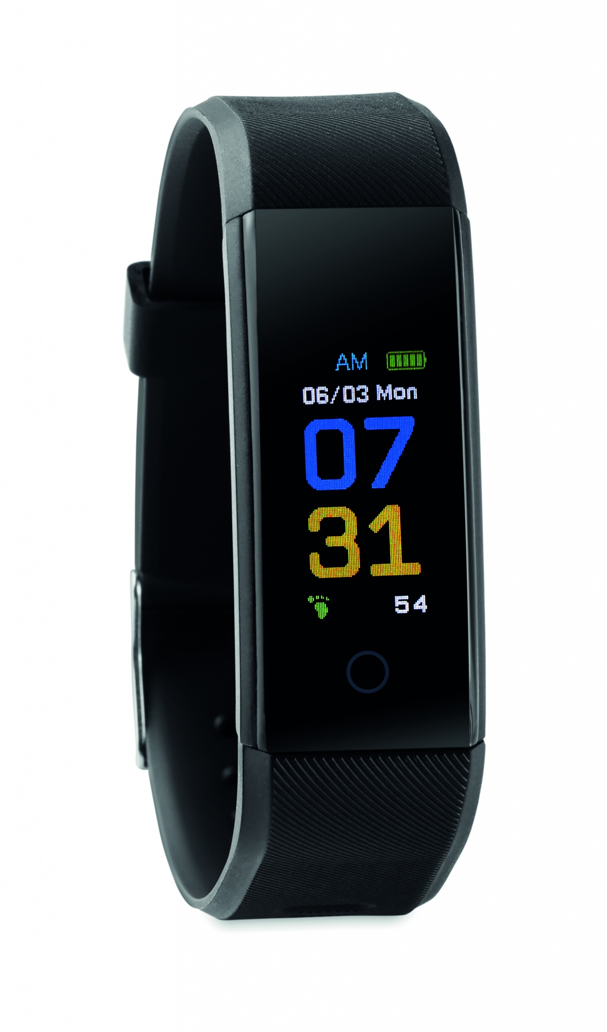 4.0 wireless Low-Energy Smart health watch with TPU detachable strap (for charging). Rechargeable Li-pol 90 mAh battery. Requires a free app (Yoho Sport) available in both iOS and Android.