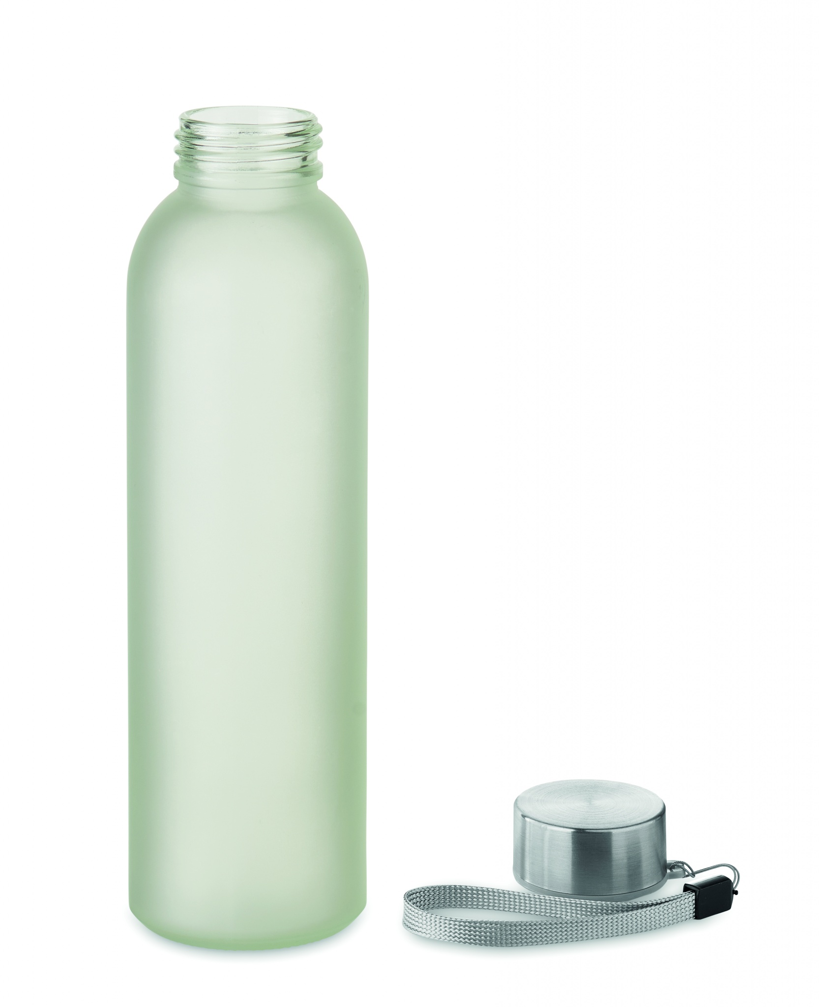 Glass bottle with special coating for sublimation. It has a stainless steel lid and hanging strap. Capacity: 500 ml.