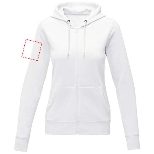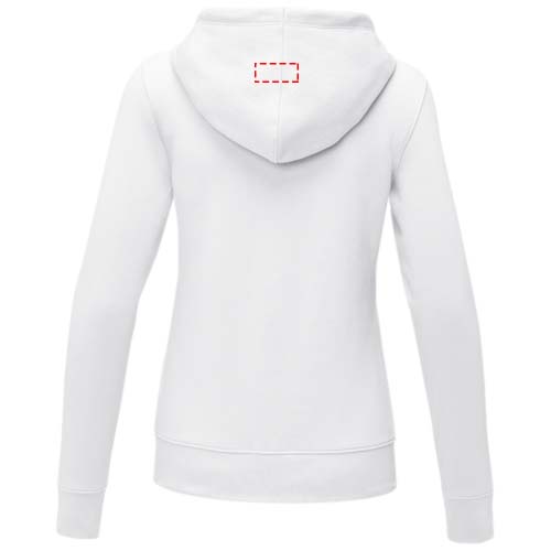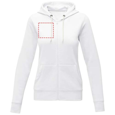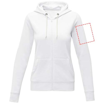 The Theron women's full zip hoodie – where style meets comfort in perfect harmony. This hoodie is a true embodiment of classic design. Additionally, the interior custom branding options allow personalised branding or customisation inside the hoodie. A kangaroo pocket combines convenience with a modern aesthetic. The flat knit rib bottom hem and cuffs guarantee a secure fit, while the brushed interior maximizes softness. The 240 g/m² fabric, blend of cotton and polyester, promises warmth and durability. Elevate your wardrobe with the Theron full zip hoodie. This hoodie is designed with a fitted shape for a feminine look.
