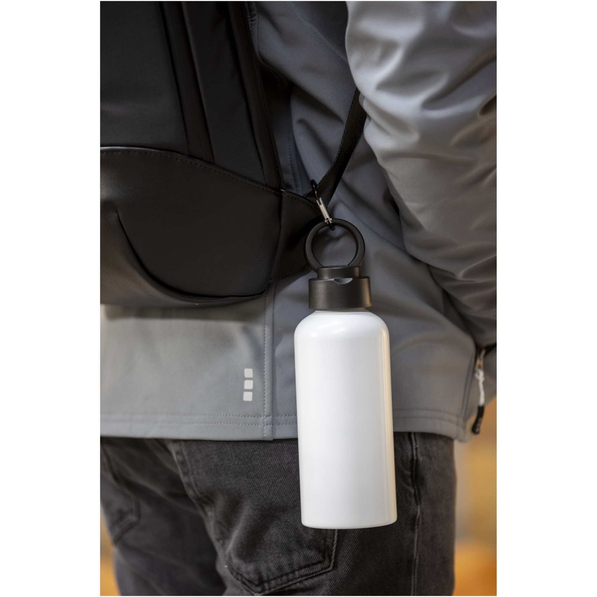 RCS certified recycled aluminium water bottle with a sleek design. Features a recycled plastic lid that has a discrete carry loop. Lightweight and easy to carry. Volume capacity: 600 ml.
