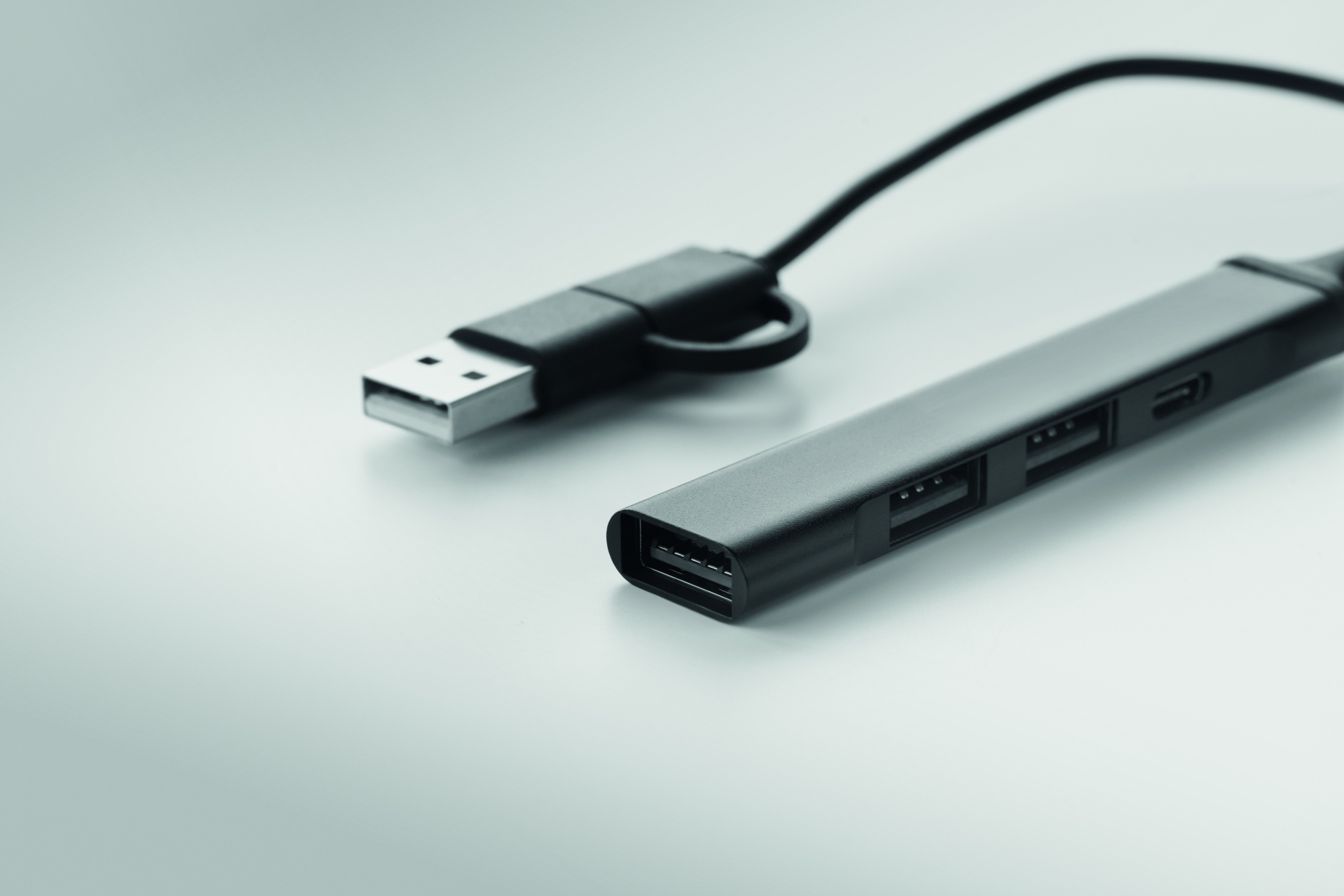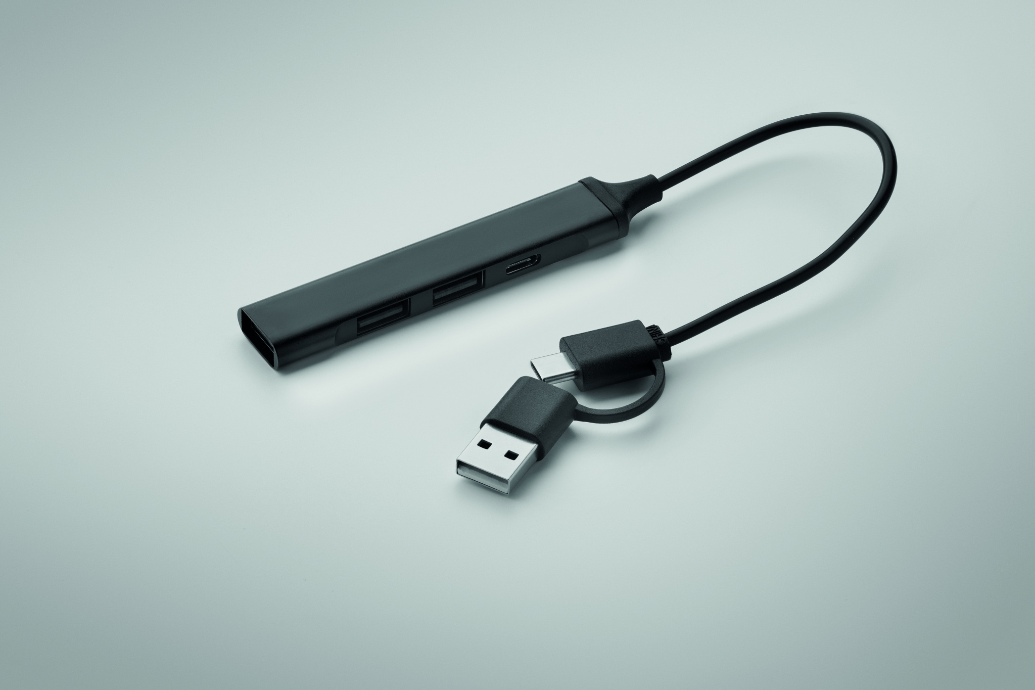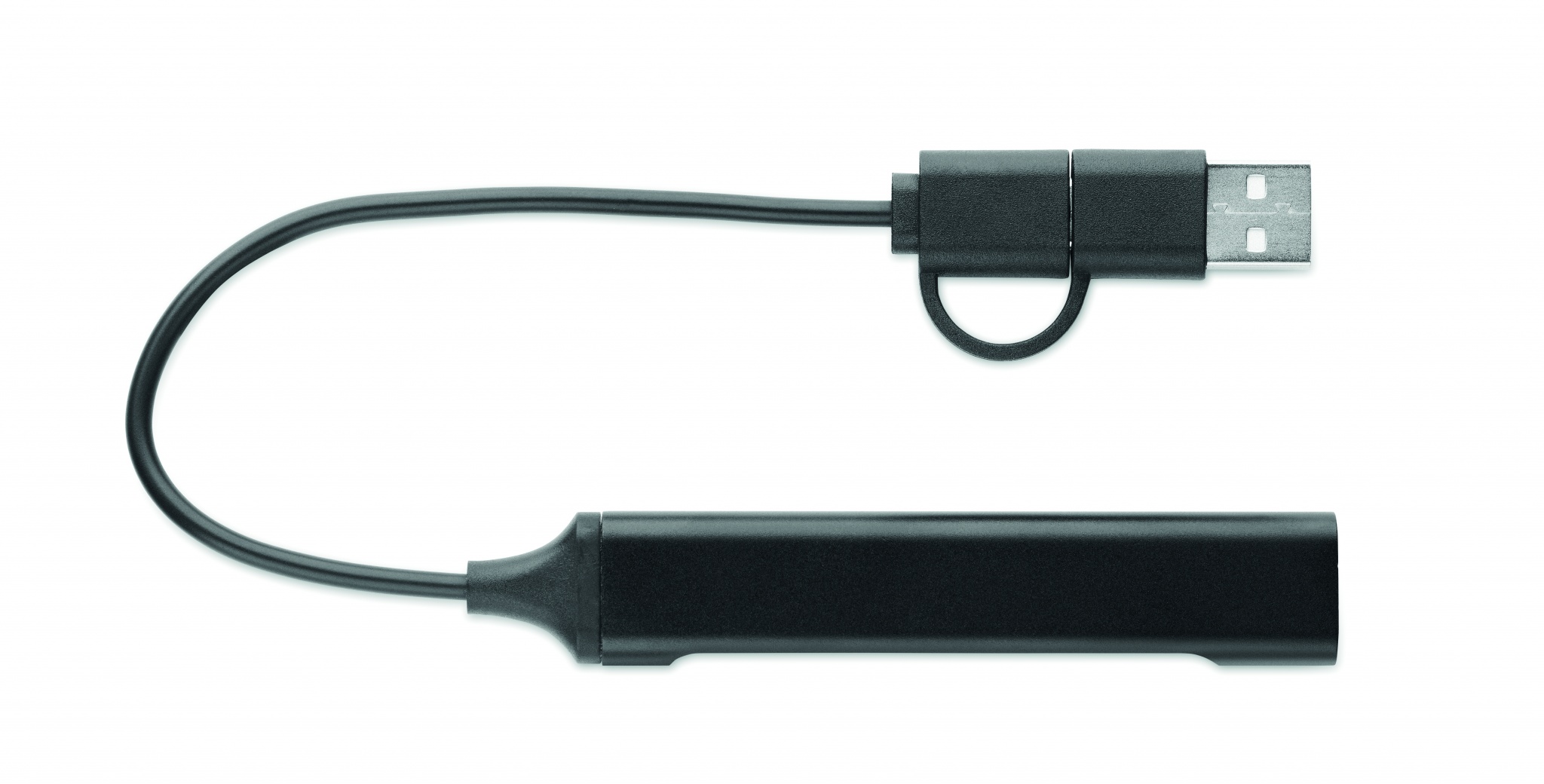 4 ports USB hub in recycled aluminium. 3 USB-A + 1 Type-C. Input: 2-in-1 Type-C & Type-A. Cable length: 19 cm.