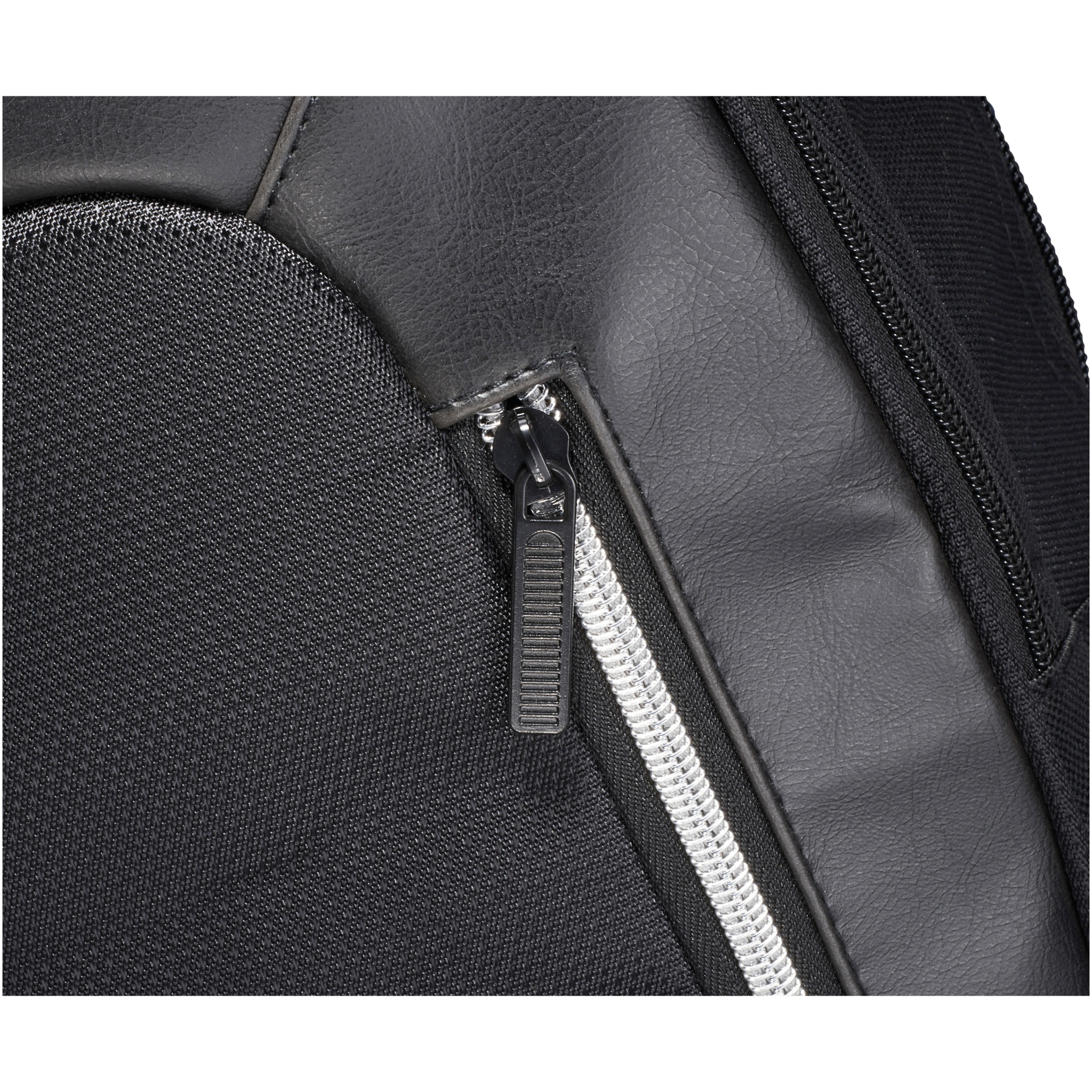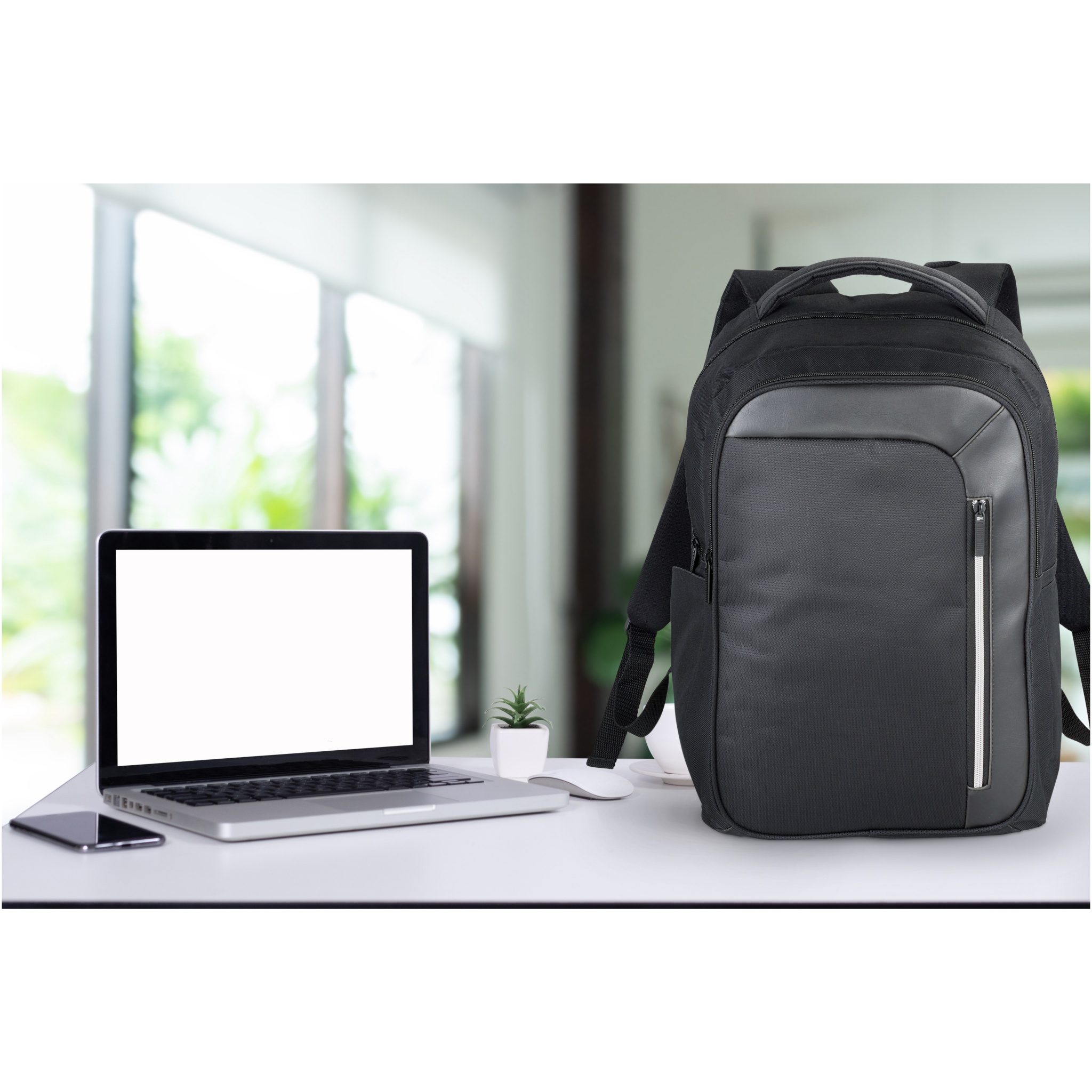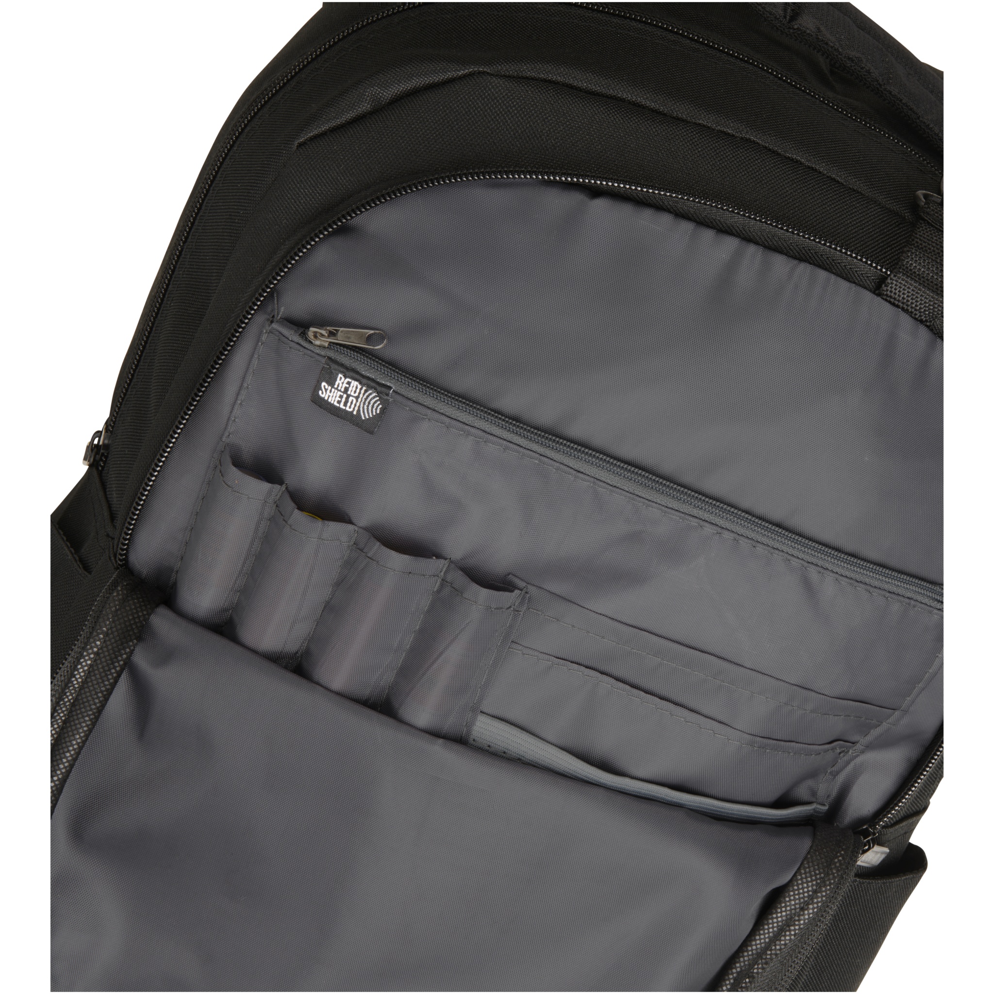 A 15" laptop backpack with multiple pockets, a padded back, and adjustable padded shoulder straps. Equipped with RFID protection and an interior organisation panel, including a key holder. There may be minor variations in the colour of the actual product due to the nature of the fabric dyes, weaves, and printing.