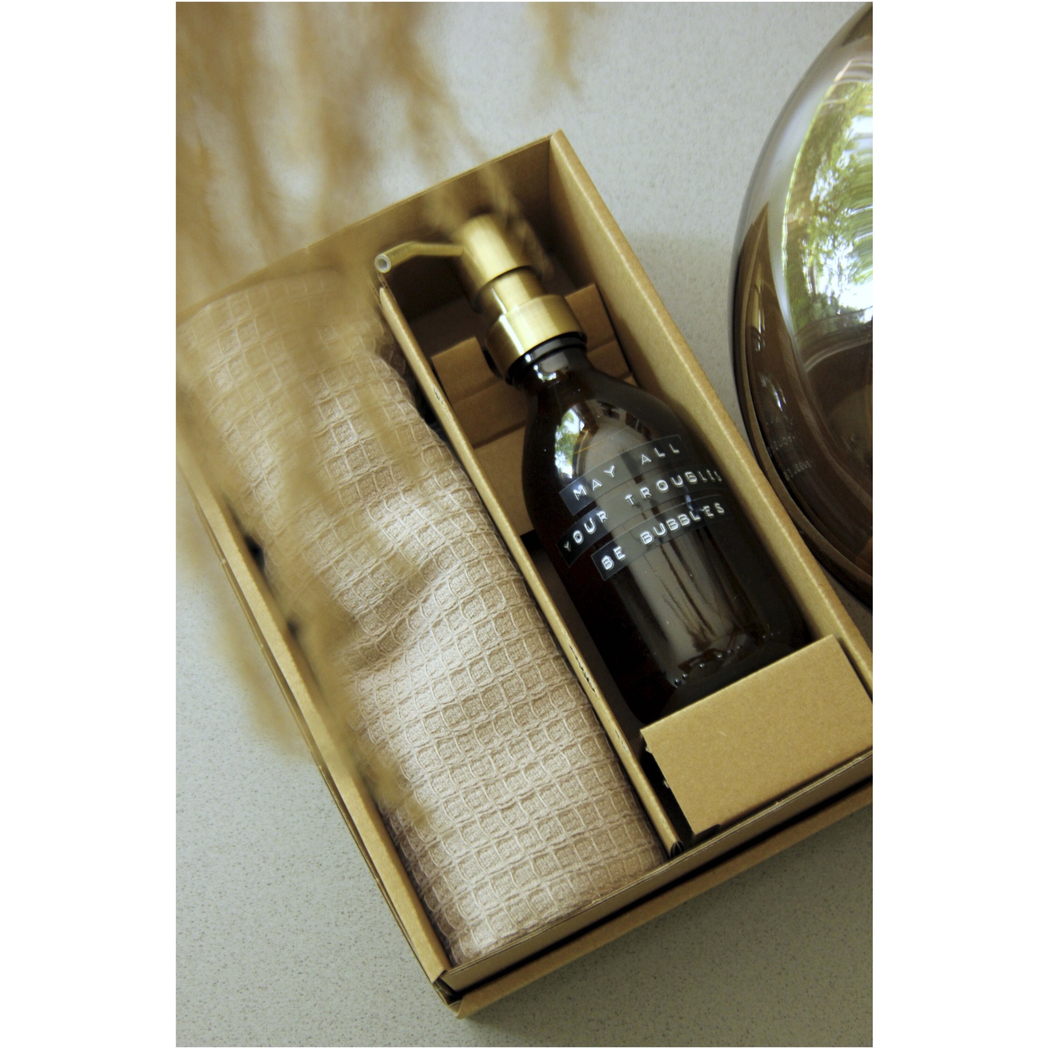 Gift set including a 250 ml bamboo scented hand soap and a beige tea towel made from organic cotton. This set is perfect as a gift for every occasion.