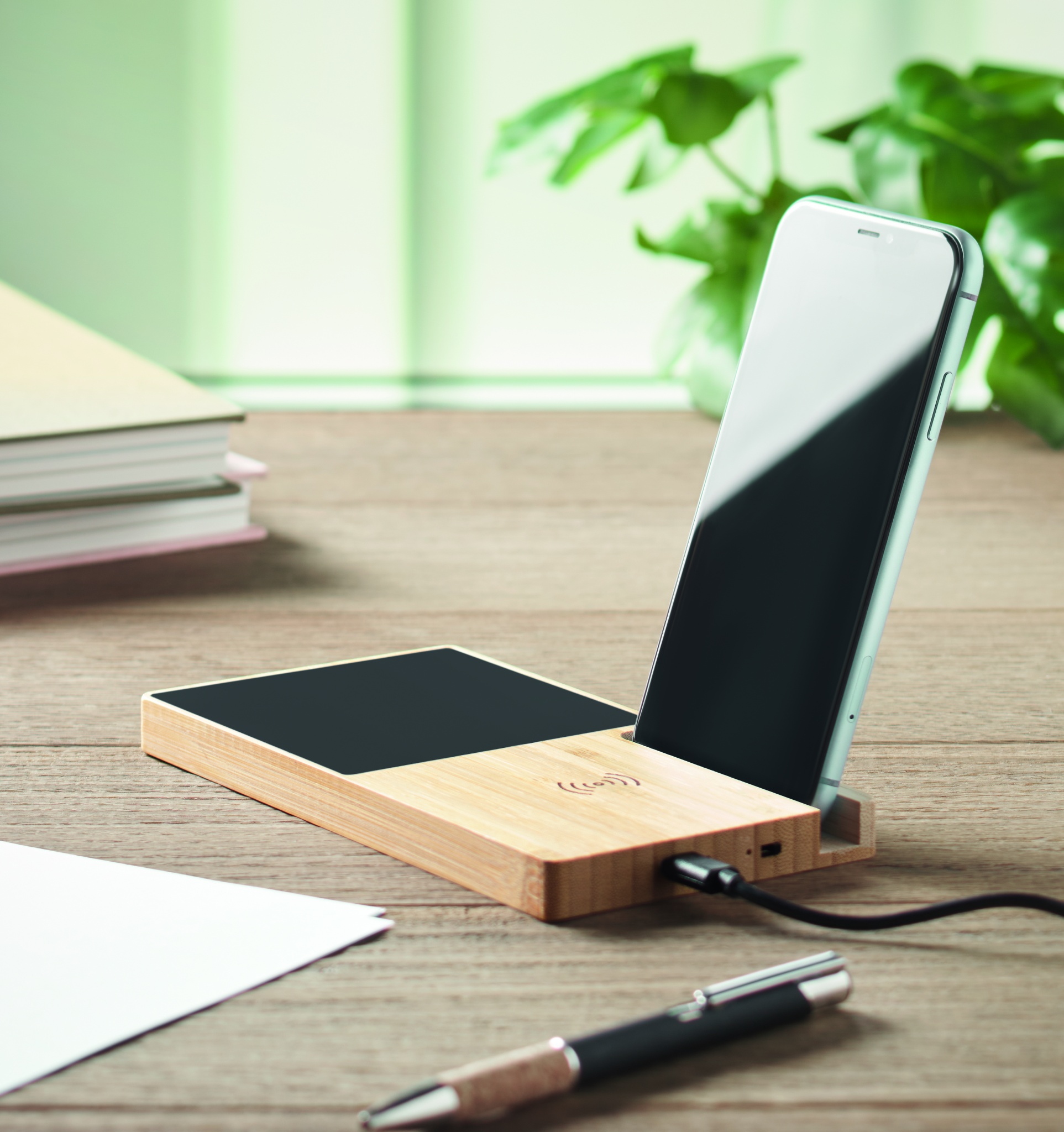 Bambusest juhtmevaba laadija koos kruusisoojendaja ja telefonialusega. Ühendage seade arvutiga, asetage nutitelefon sellele ja laske sellel laadida. Väljund: DC 9V/1,67A (15W). Ühildub kõigi QI-toega seadmetega, nagu uusimad Androidid, iPhone® 8, X ja uuemad.