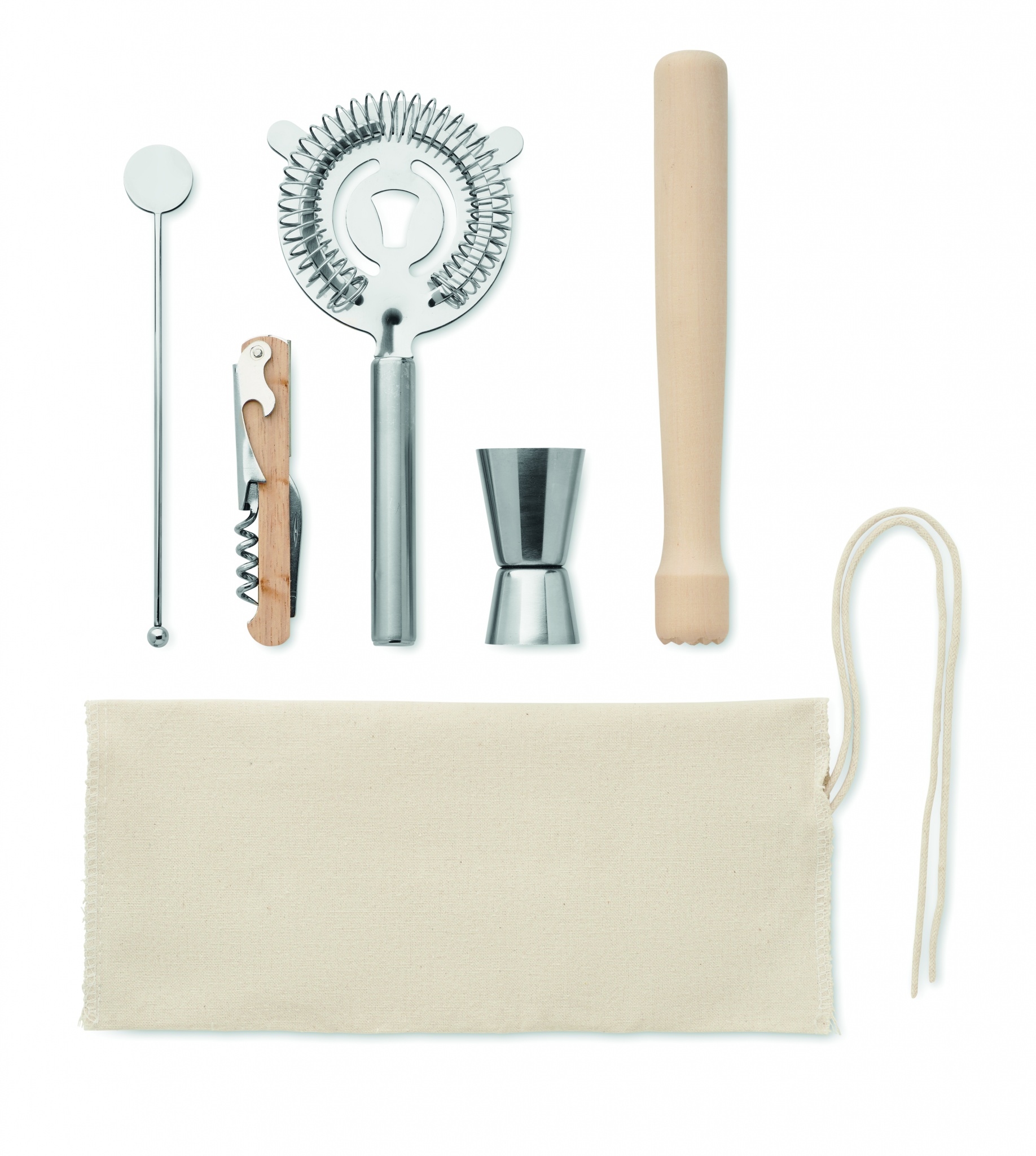 Kokteilikomplekt puuvillases nööriga kotikeses. Sisaldab 5 tükki: kahepoolne mõõtepulk (15 ja 30 ml), puidust segaja, kokteilisõel, joogisegaja ja kelneri korgitser nuga.