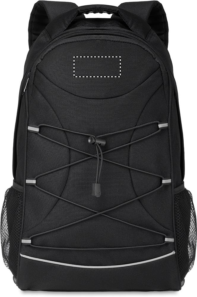 600D RPET seljakott, tumedate nööridega ees ja peegeldava esipaneeli funktsiooniga. Võrktaskud mõlemal küljel.