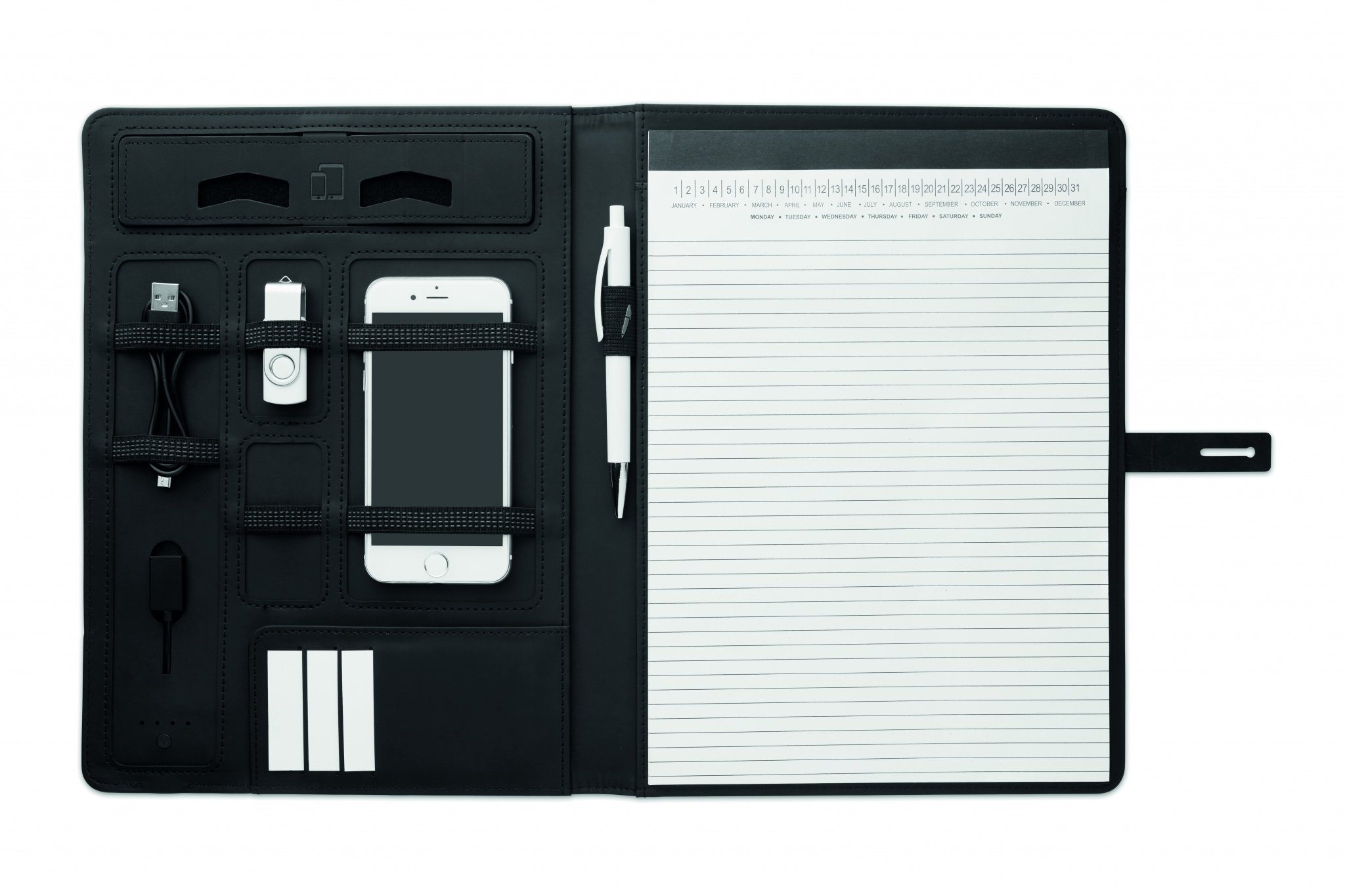A4 konverentsimappide portfolio, millel on PU-nahast kaaned, lisaks klambriga. DC5V/1A juhtmevaba laadimine. Kaasas 4000 mAh akupank koos mikro-USB-ga C-tüüpi pistikuga märkmik 20 lehega, visiitkaardihoidja, pliiatsihoidja. Must alumiiniumplaat, mis sobib ideaalselt teie logo jaoks.
