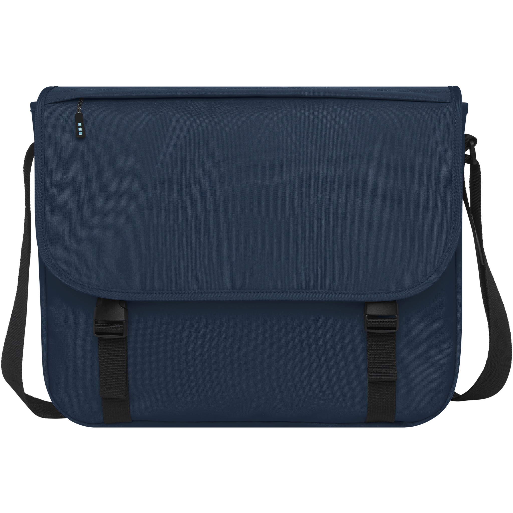 Jätkusuutlik GRS-sertifikaadiga RPET sülearvutikott, mis on valmistatud 60% taaskasutatud materjalidest. Sellel on suur lukuga põhisahtel polsterdatud 15-tollise sülearvuti varruka ja esiosaga (mõlemad takjakinnistega). Kaasas lukuga taskuga katteklapp ja pandlaga. Mugav polsterdatud ja reguleeritav õlarihm ning käru tunnel tagakülg.
