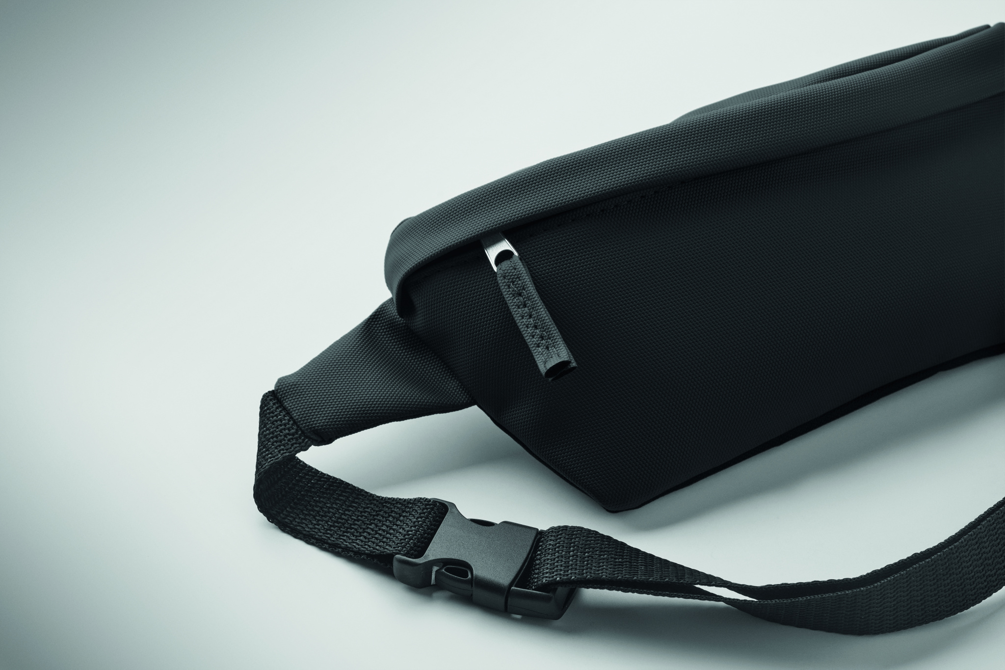 Must vöökott PU-kattega 600D RPET polüestrist, 210D RPET polüestervoodriga ja eesmise lukuga taskuga.
