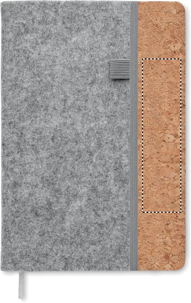 A5 märkmik RPET viltkatte ja korgiga. 160 taaskasutatud paberist joonitud lehte (80 lehte). Eest elastne pliiatsiaas, kokkusobiv elastne sulgurihm ja lehemarker.