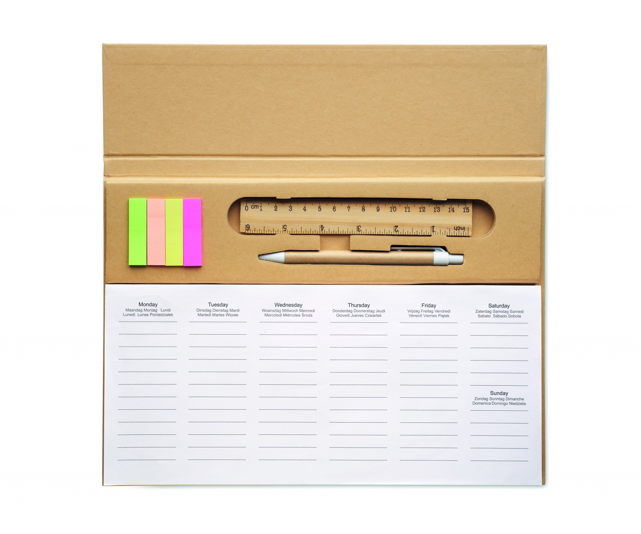125-leheküljeline iganädalane lauaplaneerija 6 keeles (EN/DE/FR/ES/IT/NL/PL) jõupaberist kaanega, pappsilindri sinise tindiga nupuvajutusega pliiats, puidust joonlaud ja märkmeplokk.