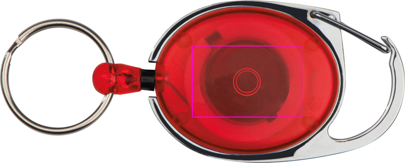 Võtmehoidja väikese haagise, klambri ja väljatõmmatava nööriga. Teie logo trükitakse värvilisele plastalale.