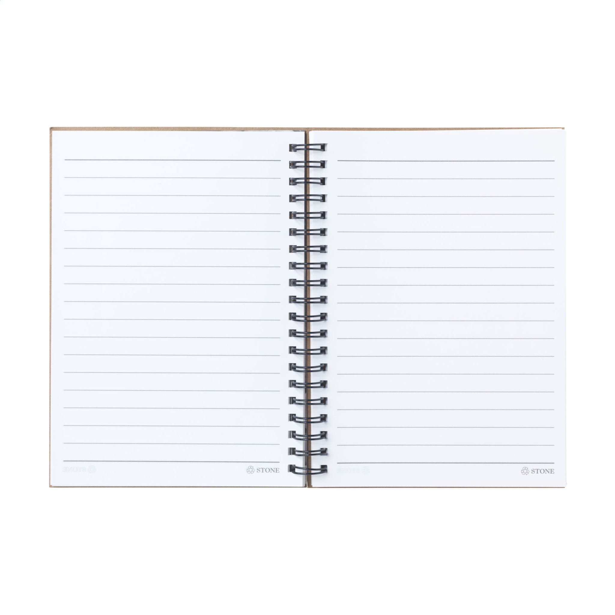 Vau! Taaskasutatud papist kaanega märkmik. 70 vooderdatud lehte / 140 joonitud lehte (120 g/m²), mis on valmistatud looduslikust kivist: 80% kaltsiumkarbonaati ja 20% HDPE plastikut. Paber on antibakteriaalne, veekindel ning rebenemis- ja plekkide suhtes vastupidav. Metallist traat-o-köitmisega.