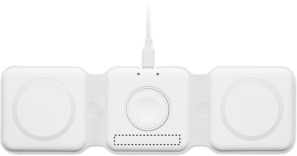Kolm-ühes kokkupandav ABS-laadimisjaam. Sellel on 3 juhtmevaba laadimiskohta (15 W). Sisend: 2-in-1 Type-C ja Type-A. Ühildub kõigi QI-toega seadmetega, nagu uusimad Androidid, iPhone® 8, X ja uuemad. Ühildub ka iWatchiga.