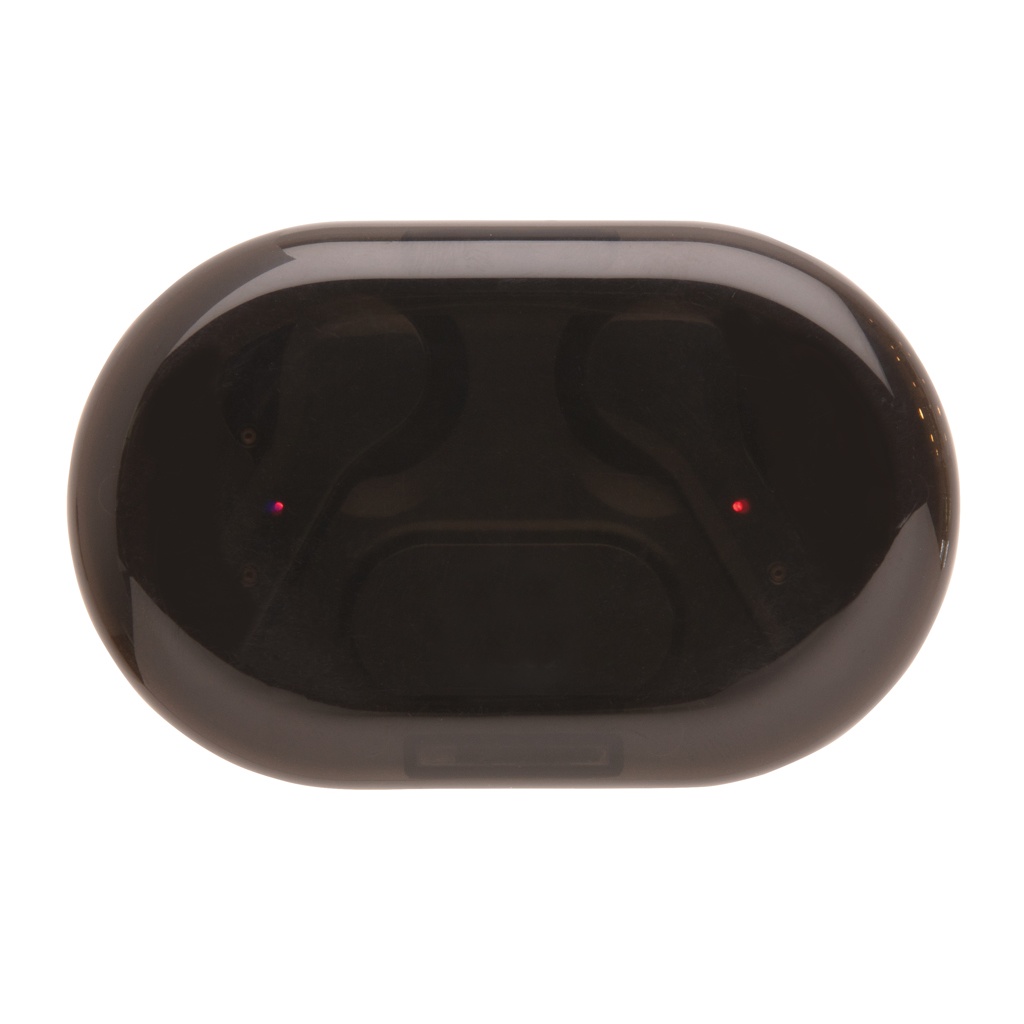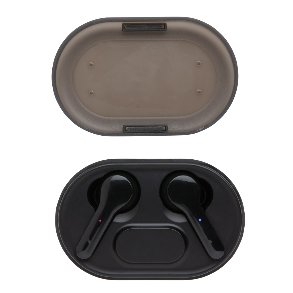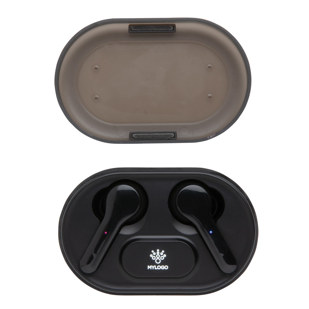 Ülim vabadus mobiilseadmest muusikat kuulates. Need TWS-i kõrvaklapid on 300 mAh juhtmevaba laadimisümbrises, millel on lisavõimalus lisada ümbrise laadimisel süttiv logo. Kõrvaklapid laetakse uuesti 1,5 tunniga ja nende mänguaeg on kuni 3 tundi. BT 5.0 mobiilseadmega automaatseks sidumiseks ja kõrvaklappide sidumiseks. Töökaugus kuni 10 meetrit. Kaasas PVC-vaba TPE mikro-usb kaabel laadimisümbrise laadimiseks. Kõnedele vastamise funktsiooniga. Kaasas 3 suuruses kõrvaotsad, mis sobivad kõigile.