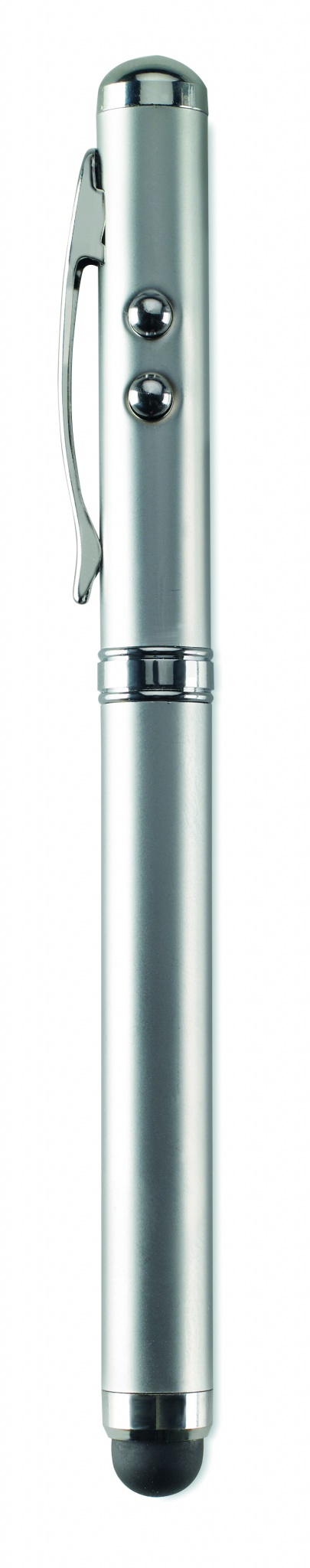 Metallist laserpointer. Valge LED-tuli, punane laserkursor ja pehme puutetundlik ots. Kaasas 3 nööpelemendi patareid. Tarnitakse metallist plekkkarbis.