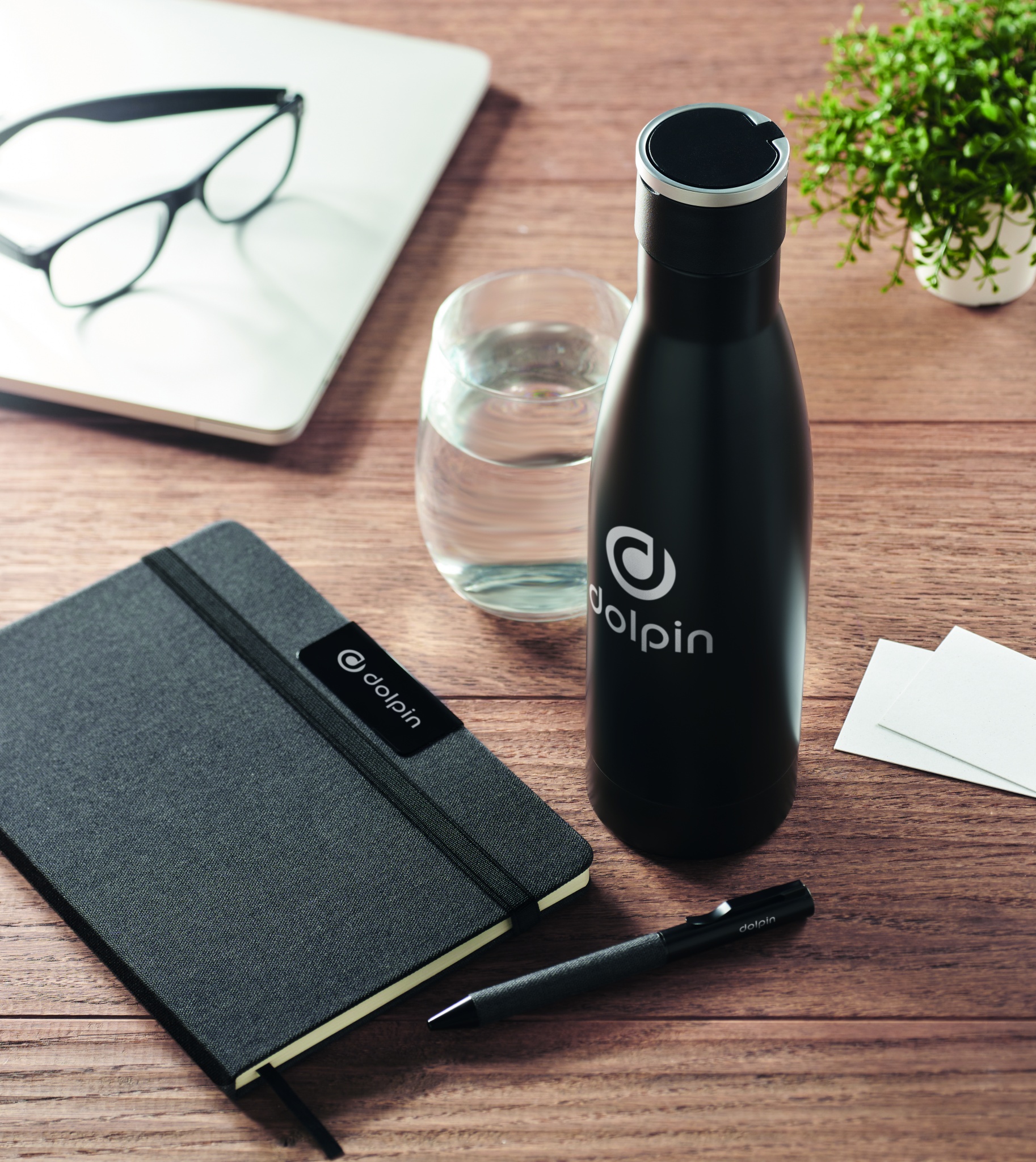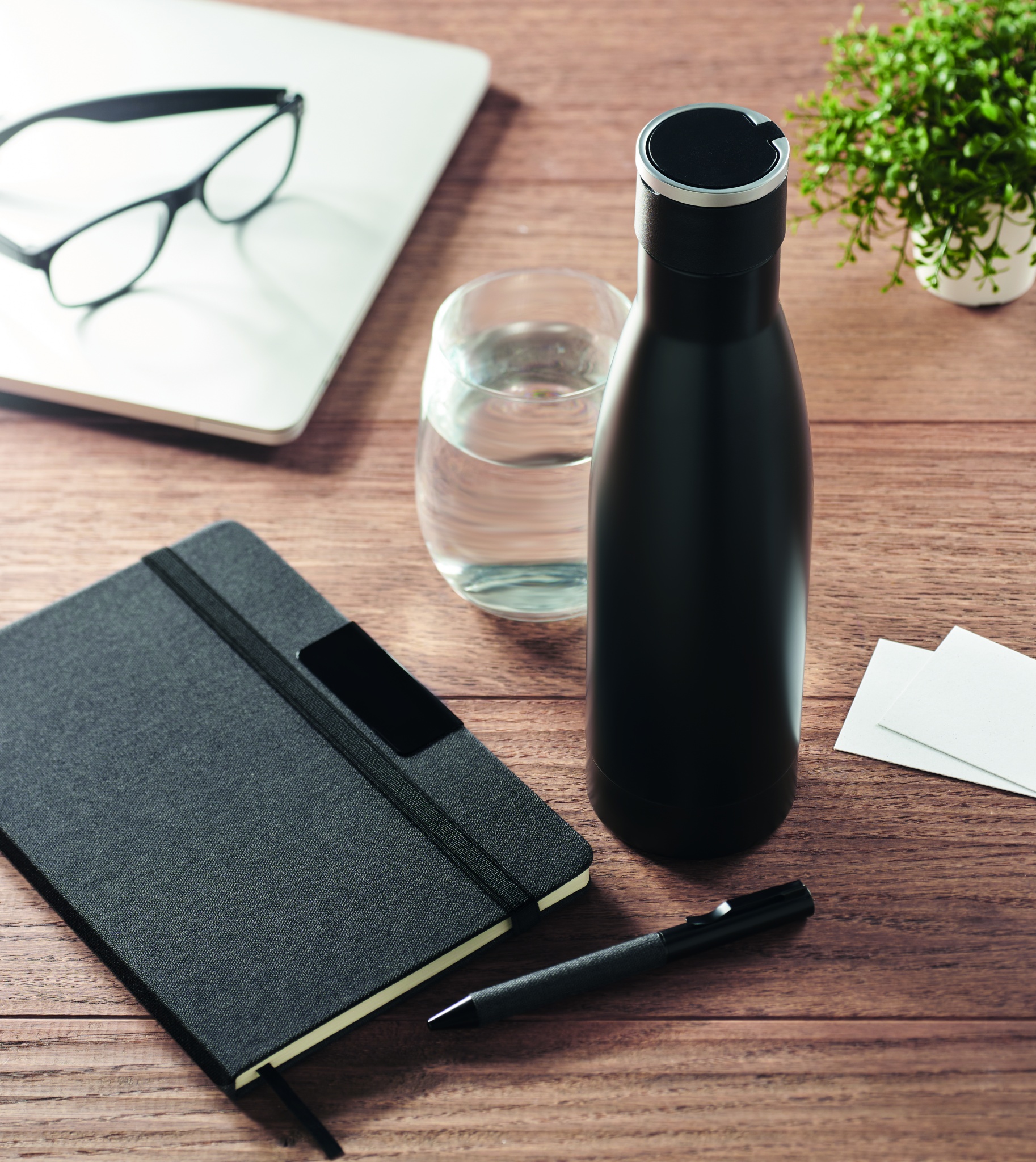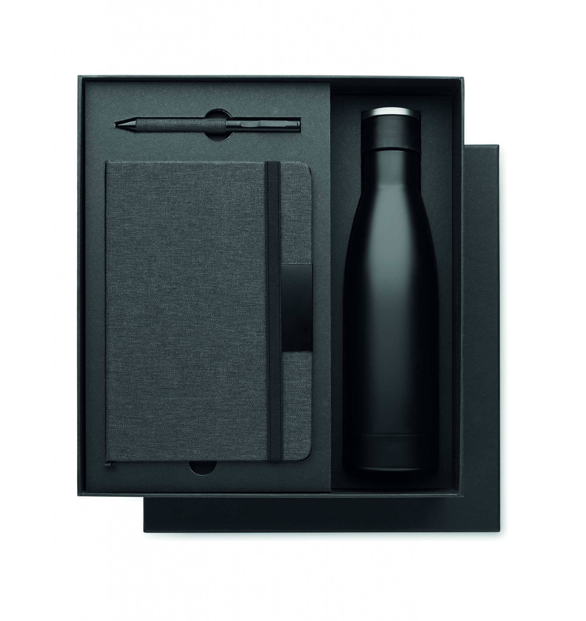 Luksuslik 3-osaline kinkekomplekt. Kaasas kõva RPET-kaanega A5-formaadis sülearvuti. Casebound. 160 joonega taaskasutatud paberilehte (80 lehte). Sobiv elastne sulgemisrihm ja lindiga lehemarker ja pliiatsihoidja. Sobiv keeratav pastapliiats. Kahe seinaga roostevabast terasest vaakumisolatsiooniga pudel. Mahutavus: 500 ml. Esitatakse luksuslikus kinkekarbis.