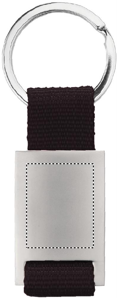 Metallist ristkülikukujuline võtmehoidja värvilise polüesterrihmaga. Üksikult pakendatud kartongist kinkekarpi.