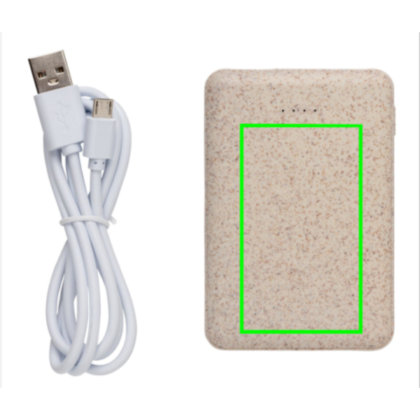 Ülikompaktne 5000 mAh akupank, mis on valmistatud naturaalsest nisukiust (35%), mis on segatud ABS-iga ja mahub nii ideaalselt taskusse, et võite selle kõikjale kaasa võtta. Täielikult laetuna annab see teile piisavalt energiat mobiiltelefoni kuni kolm korda laadimiseks. Akupank sisaldab kauakestvat A-klassi 5000 mAh suure tihedusega liitiumpolümeerakut. Kahe USB-pordiga. Toiteindikaatorid näitavad järelejäänud energiataset, nii et teate alati, millal laadida. Sisend 5V/2A. Väljund USB 1: 5V/2A Väljund USB 2: 5V/1A