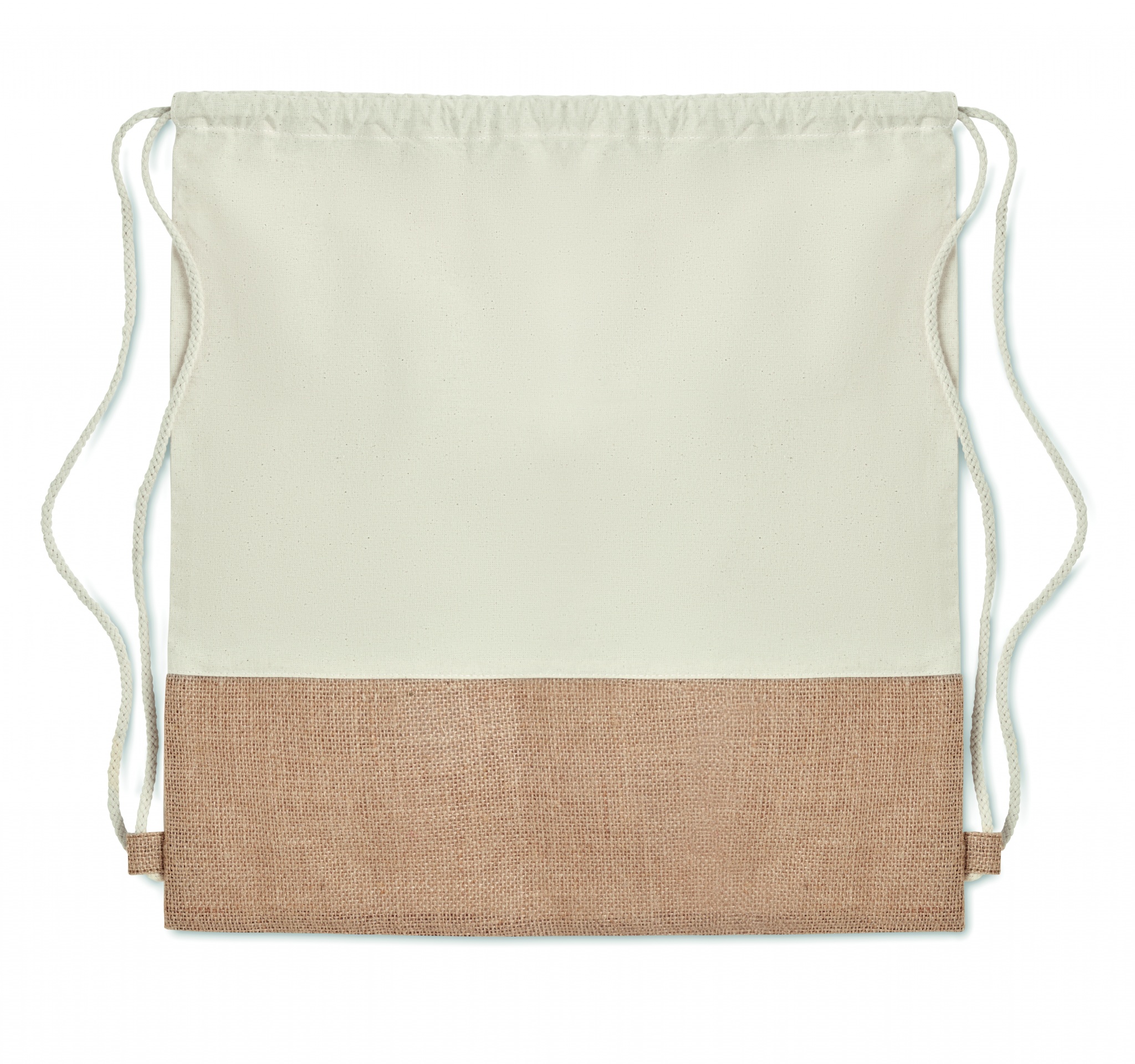 Toimsest puuvillasest nööriga kott džuudist detailidega. 160 gr/m².
