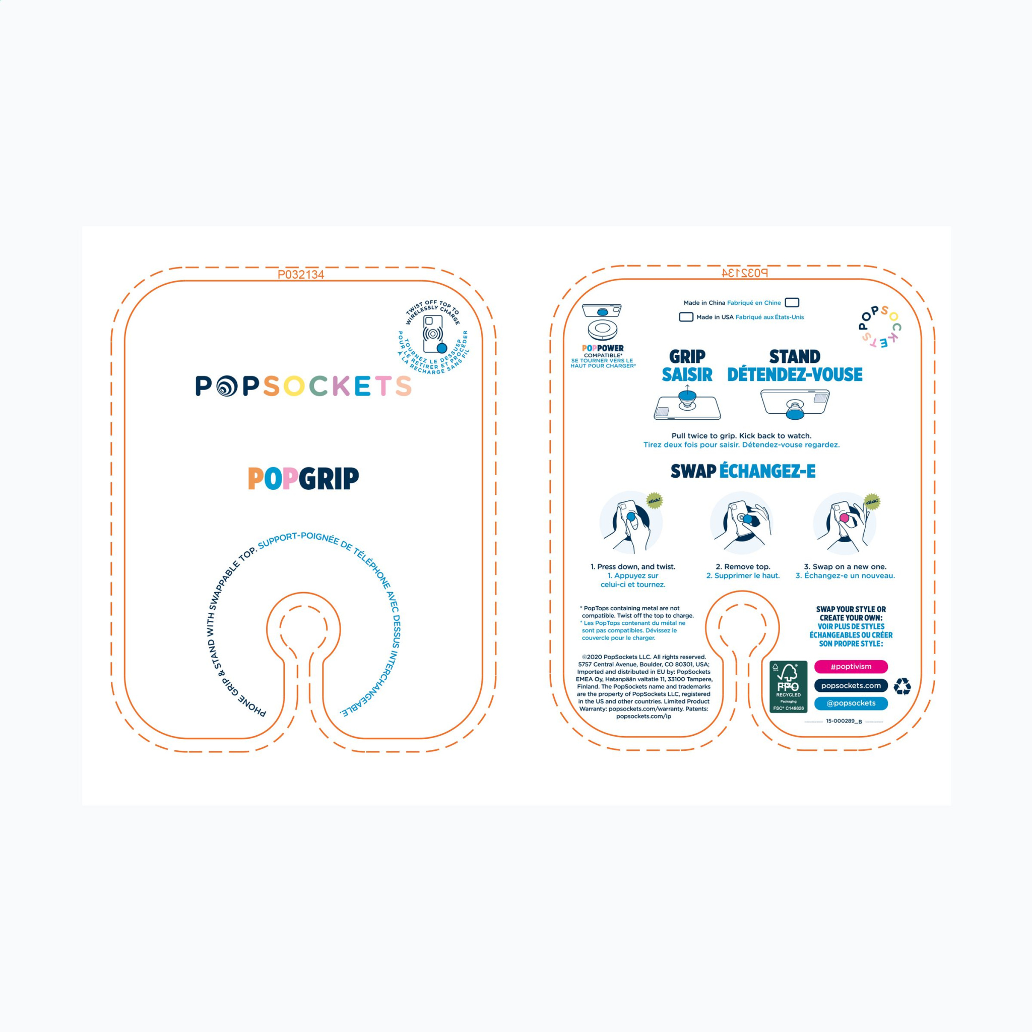 PopSocket® on mugav multifunktsionaalne telefonitarvik. Uue vahetatava plastikust PopGripi ja vahetatava PopTopiga. See PopGrip ühildub juhtmevaba laadimisega tänu PopTopi hõlpsale eemaldamisele. Kinnitage see element oma telefoni tagaküljele 3M kleepribaga ja kasutage käepäraseid funktsioone: mugavat käepidet paremaks hoidmiseks, funktsionaalset alust ja selfie-hoidjat. Saab paigutada 2 erinevasse hüpikakende asendisse ja paindlik, et saaksite nutitelefoni mis tahes viisil paigutada. PopSocket®-i on lihtne eemaldada ja seda saab uuesti kasutada kuni 10 korda. Sobib kõikidele sagedamini kasutatavatele nutitelefonidele, iPhone'idele ja muudele seadmetele. PopSocket®-i optimaalseks kasutamiseks ja hooldamiseks lugege kaasasolevaid juhiseid. Lisainfo tarneaja kohta: 60 - 2500 ühikut: 1 nädal, 2500 - 5000 ühikut: 2 nädalat. Rohkem kui 5000 ühikut, hind ja tarneaeg soovi korral. PopSockets® on saadaval ainult trükiga.