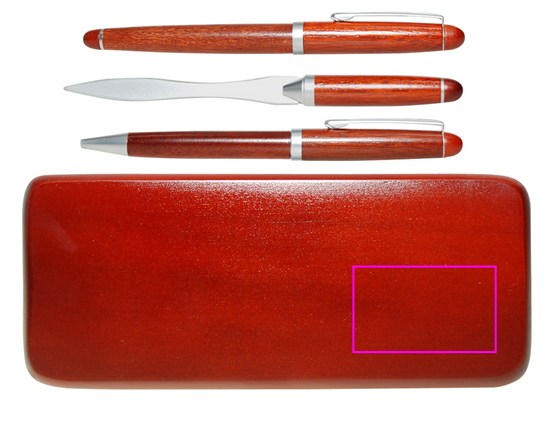 Roosipuu komplekt sisaldab: keerdmehhanismiga puidust pastapliiatsit sinise kirjaga metallist täidisega, puidust täitesulepead sinise kirjutuskassetiga ja kirjaavaja. Teie logo graveeritakse karbile.