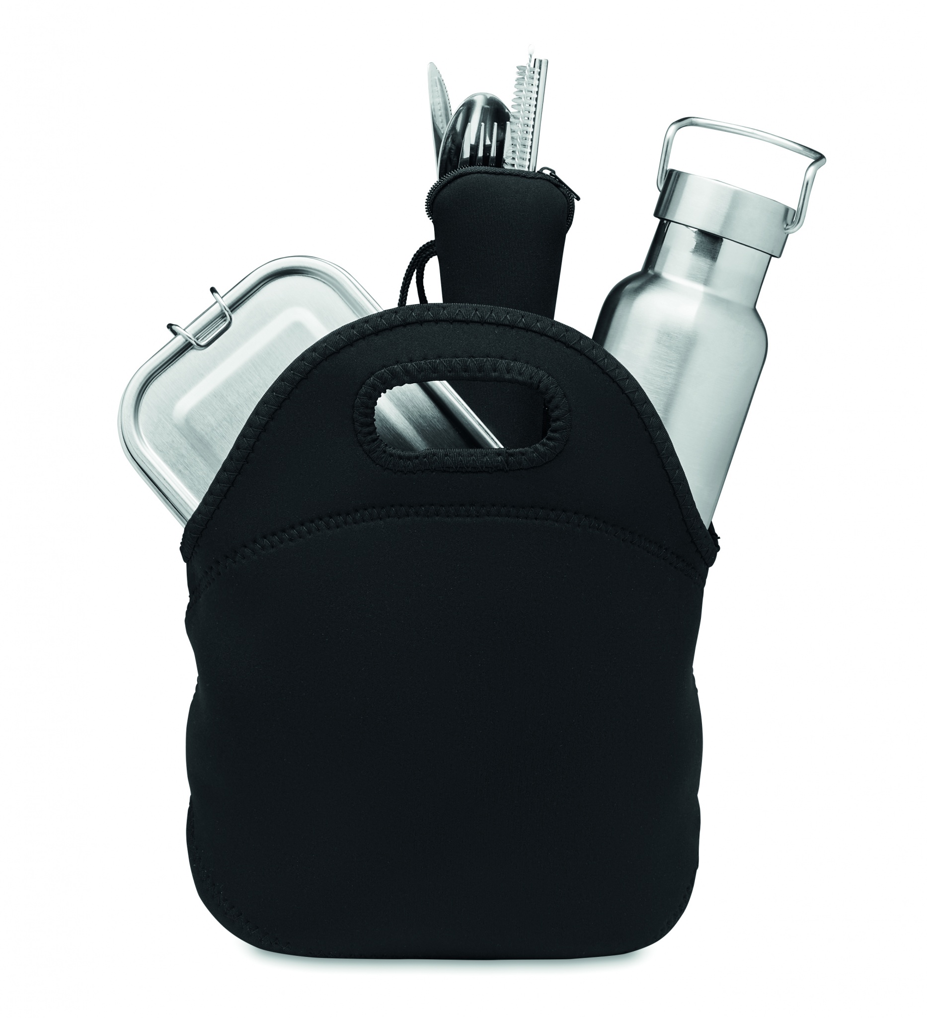 Lõunasöögikomplekt neopreenkotis. Sisaldab kahekordse seinaga roostevabast terasest vaakumpudelit (500 ml), lõunakarpi (600 ml) ja söögiriistu lukuga neopreenkotis.