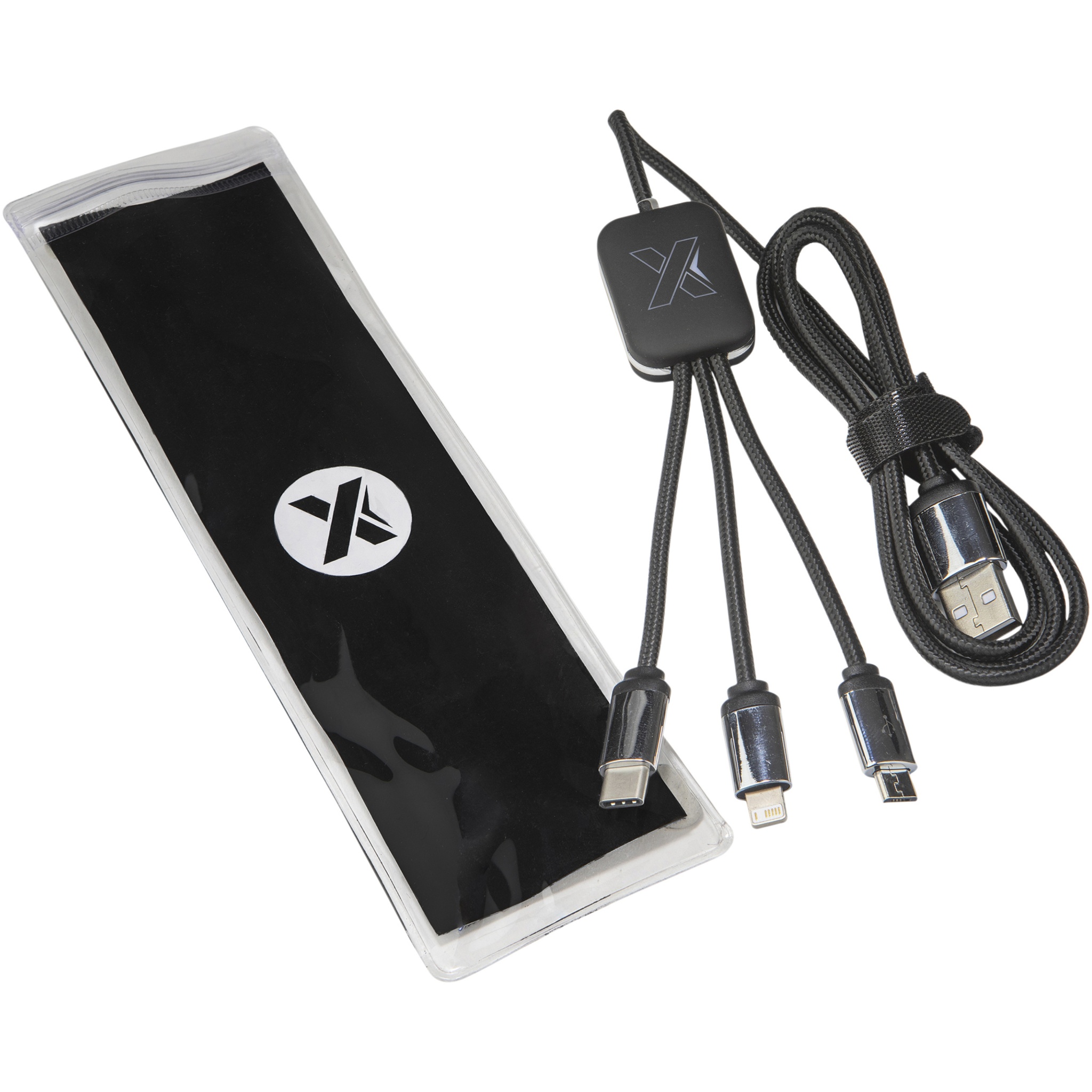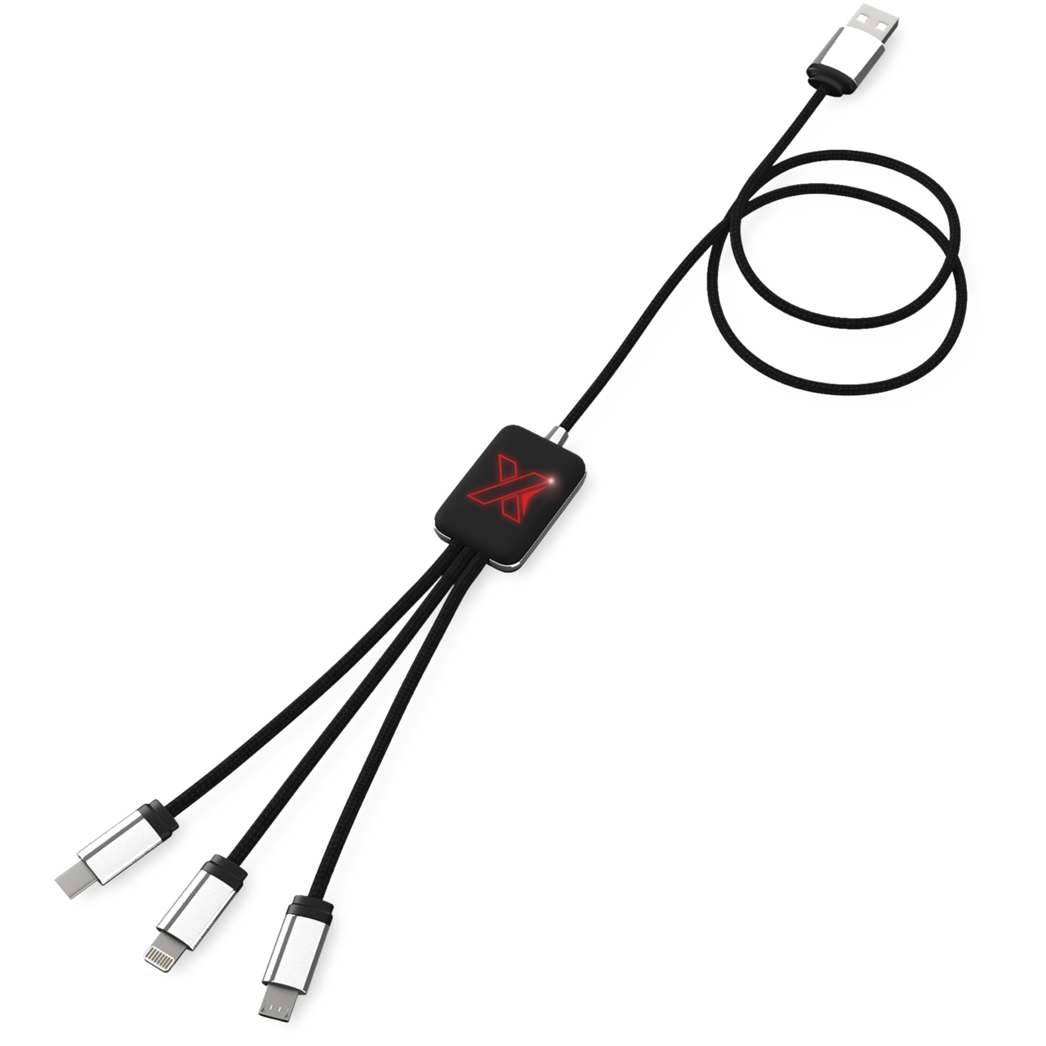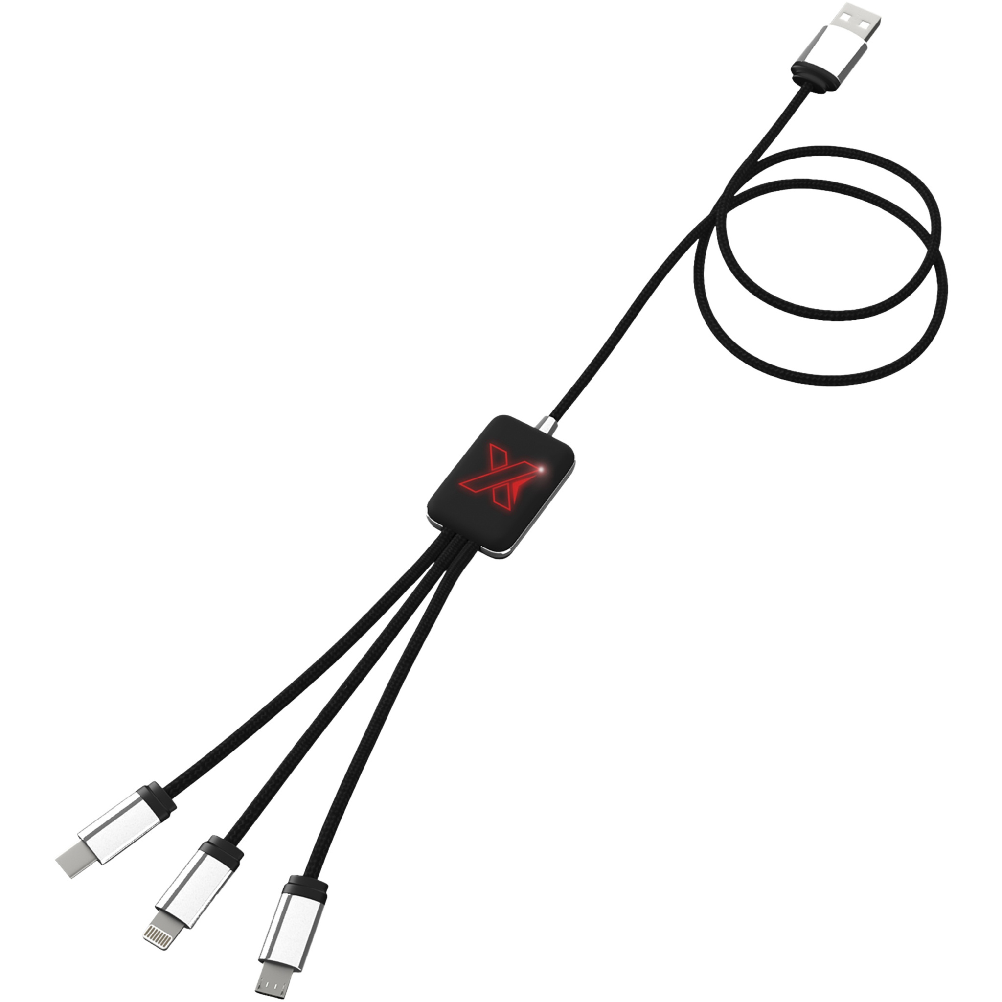 Kummist ja metallist viimistlusega valgustatud logoga laadimiskaabel, millel on kolm pistikut (C-tüüp, Android, iPhone). Üheaegselt saab laadida kuni kolme seadet. Kaablite pikkus (koos pistikutega): 10 cm. Kaabli kogupikkus: 1 meeter. Taaskasutatud PET-plastist kaabel ja pakend on valmistatud taaskasutatud paberist ja taaskasutatud plastist.