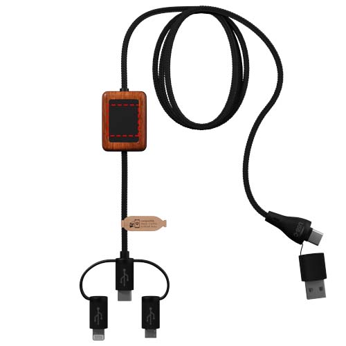 Kummist bambusest viimistlusega laadimiskaabliga andmeedastus ja topeltvalgustusega logo. Kaabel on valmistatud säästvatest materjalidest: taaskasutatud ABS-plastist ja taaskasutatud pudelitest rPET. Seda saab kasutada koos Apple CarPlay ja Android Autoga autorakenduste jaoks. Tänu kahele USB-A ja USB-C väljundile ühildub kaabel 100% turul uusimate arvutitega (USB-C). Kaablit saab kohandada kahe valgustusega logoga (üks mõlemal küljel). Kaabli pikkus: 1 meeter. Tarnitakse biolagunevas TPU kotis (17,5 x 5,5 cm) koos paberkaardiga. Sisaldab 3-aastast garantiid.