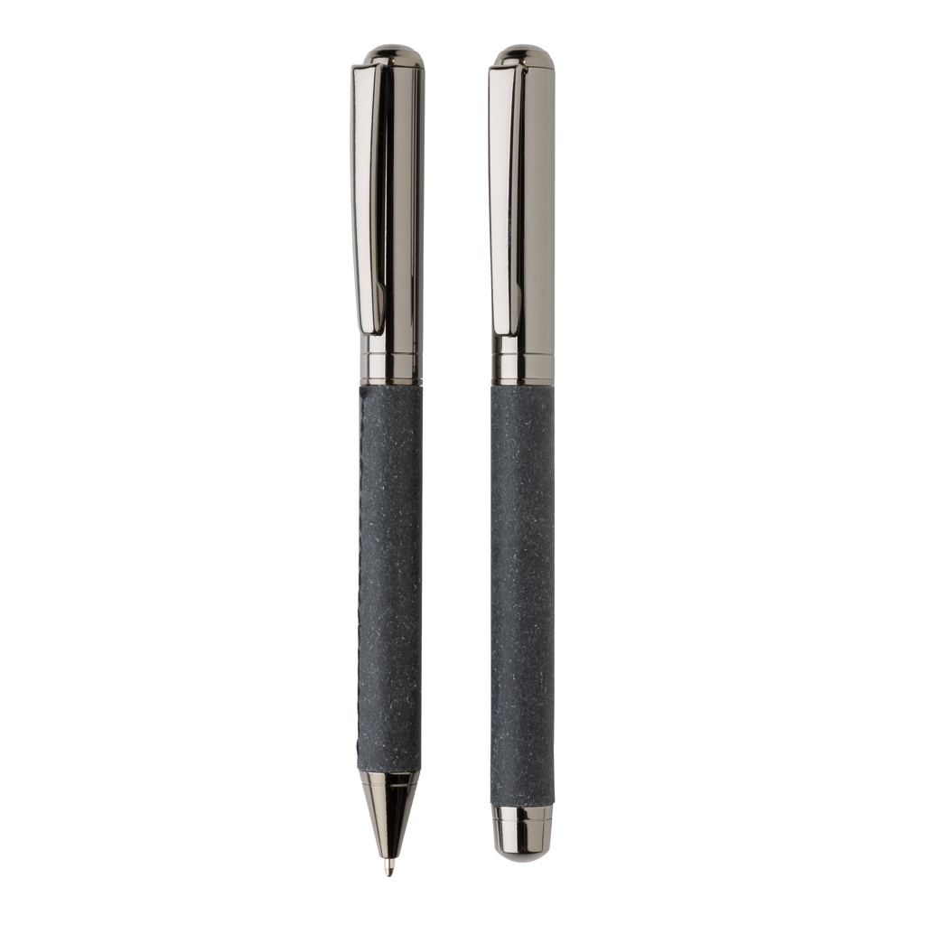 See kaunis pliiatsikomplekt on valmistatud taaskasutatud nahast. Komplektil on elegantne gunmetal värviline disain, stiilne ja ideaalne oma märkmete stiilseks kirjutamiseks. See sisaldab kuulipalli ja rullpalli. Iga pliiats sisaldab sinist dokumentaaltinti. Pliiatsi kirjutuspikkus on 1200 meetrit ja rullpalli 400 meetrit. Pliiatsikomplekt on taaskasutatud nahast kotis ja kinkekarbis, millel on taaskasutatud nahast muster.