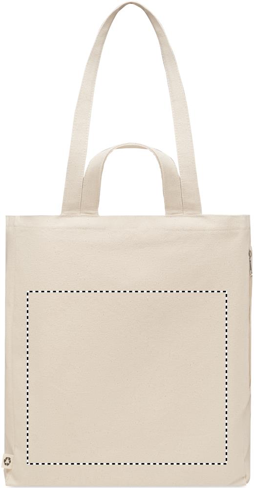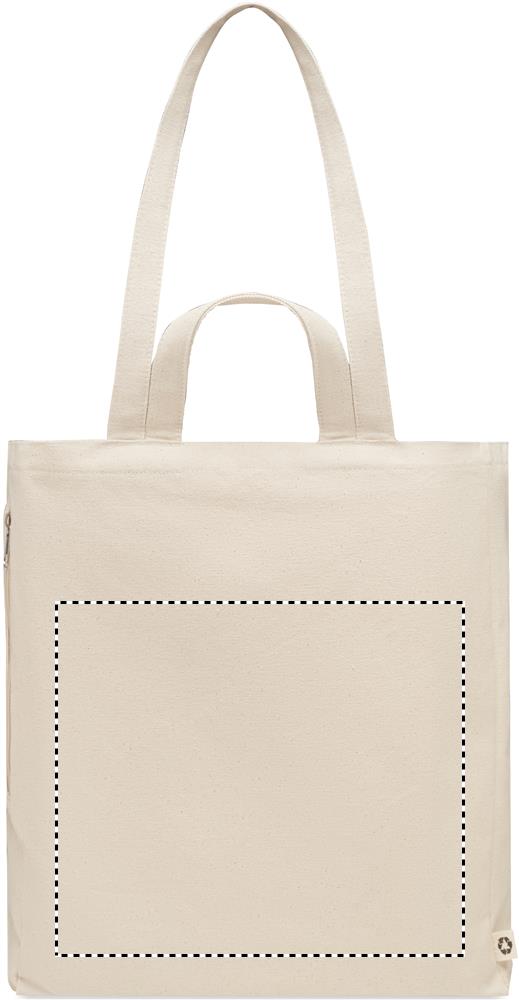 Taaskasutatud polüpuuvillasest ostu- või rannakott (70% taaskasutatud puuvill, 30% taaskasutatud polüester) lühikeste sangadega. Sellel on külgmine lukuga tasku. 380 gr/m².