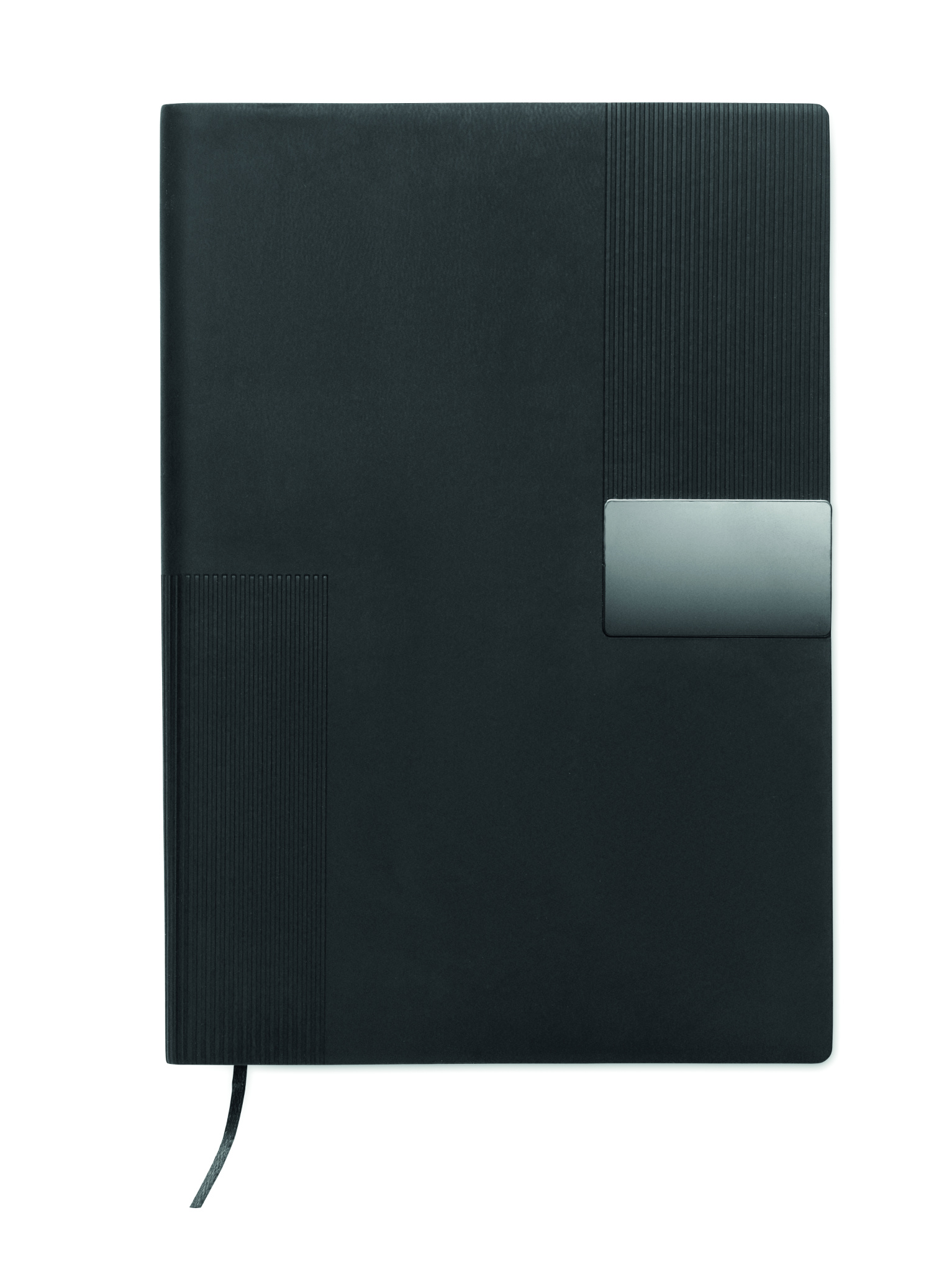 A5 formaadis PU-märkmik pehmete kaantega. 160 lehekülge (80 lehte) taaskasutatud paberist. Kummipaelaga suletav, järjehoidjaga. Metallist detail esiküljel.