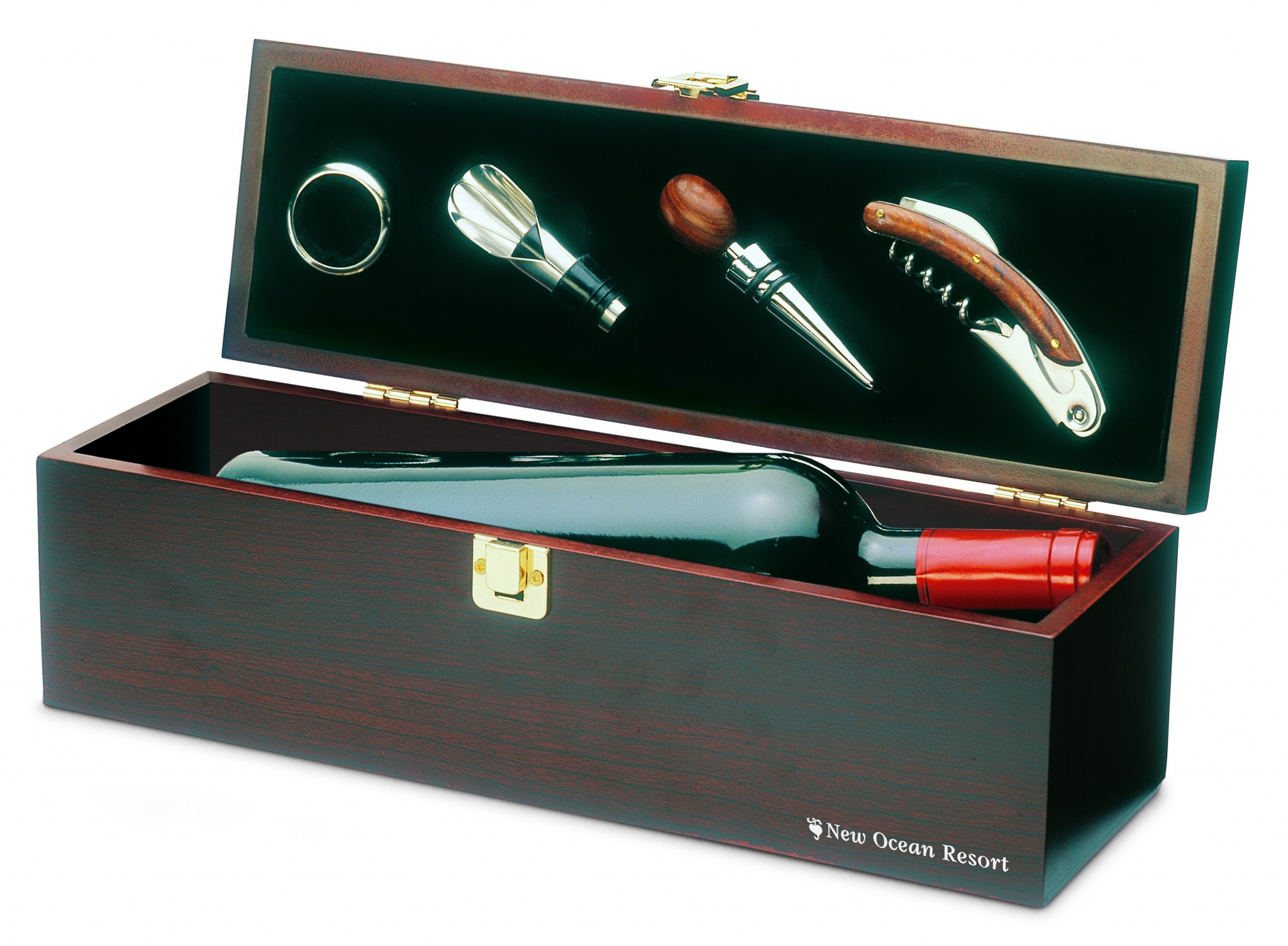 Veinikomplekt puidust kinkekarbis, kus on ruumi ühele veinipudelile. Kaasas pudeli krae, valaja, kork ja korgitser. Veinipudel ei kuulu komplekti.