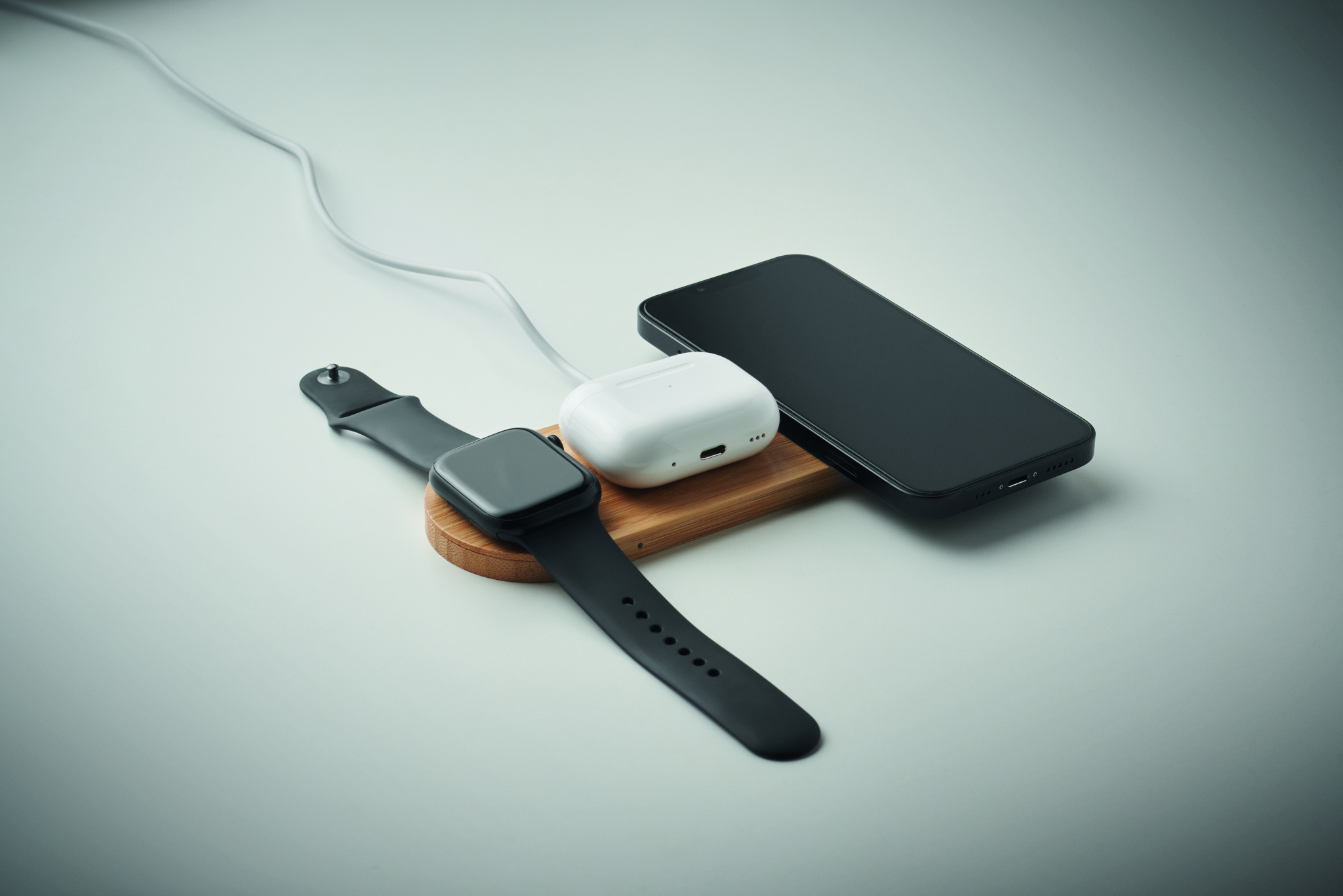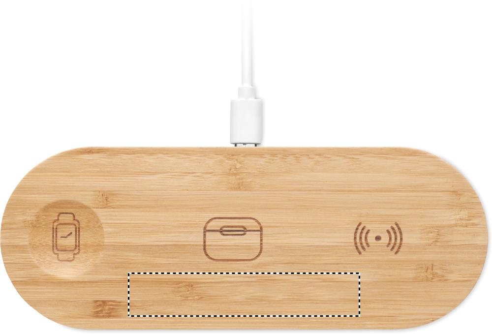 3-in-1-latausasema bambukotelossa. Sisältää langattoman laturin 15 W, älykellolaturin (vain Apple®) ja TWS-laturin.