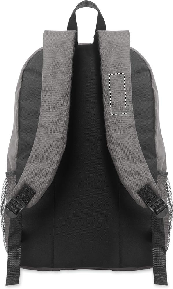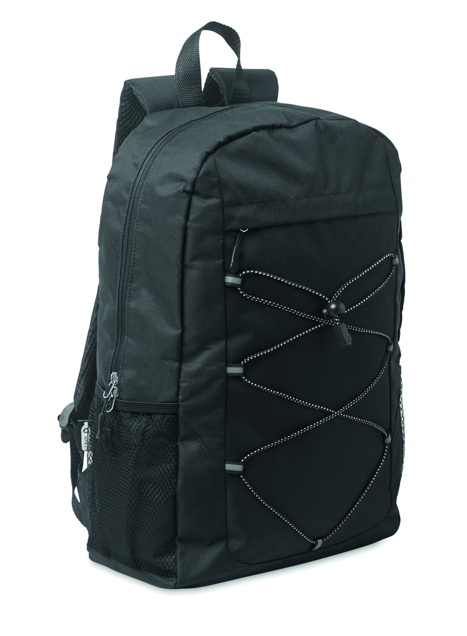 Reppu 600D RPET-polyesteristä koristenauhalla ja vetoketjullisella etupaneelilla. Verkkotaskut molemmilla puolilla.