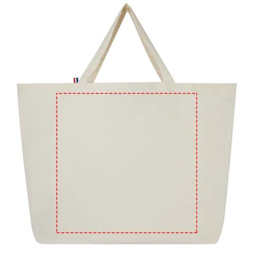 Tämä kassi on valmistettu laadukkaasta 100% kierrätysmateriaalista. 200 g/m² puuvilla/ polyester sekoitemateriaalista valmistettu kassi kestää päivittäistä käyttöä ja sopii raskaiden kirjojen tai ruokaostosten kuljettamiseen, kantokyky 14 kg. Kankaan kuitu on valmistettu Aasiassa, kudonta ja kehräys ja valmistus tehdään Ranskassa.