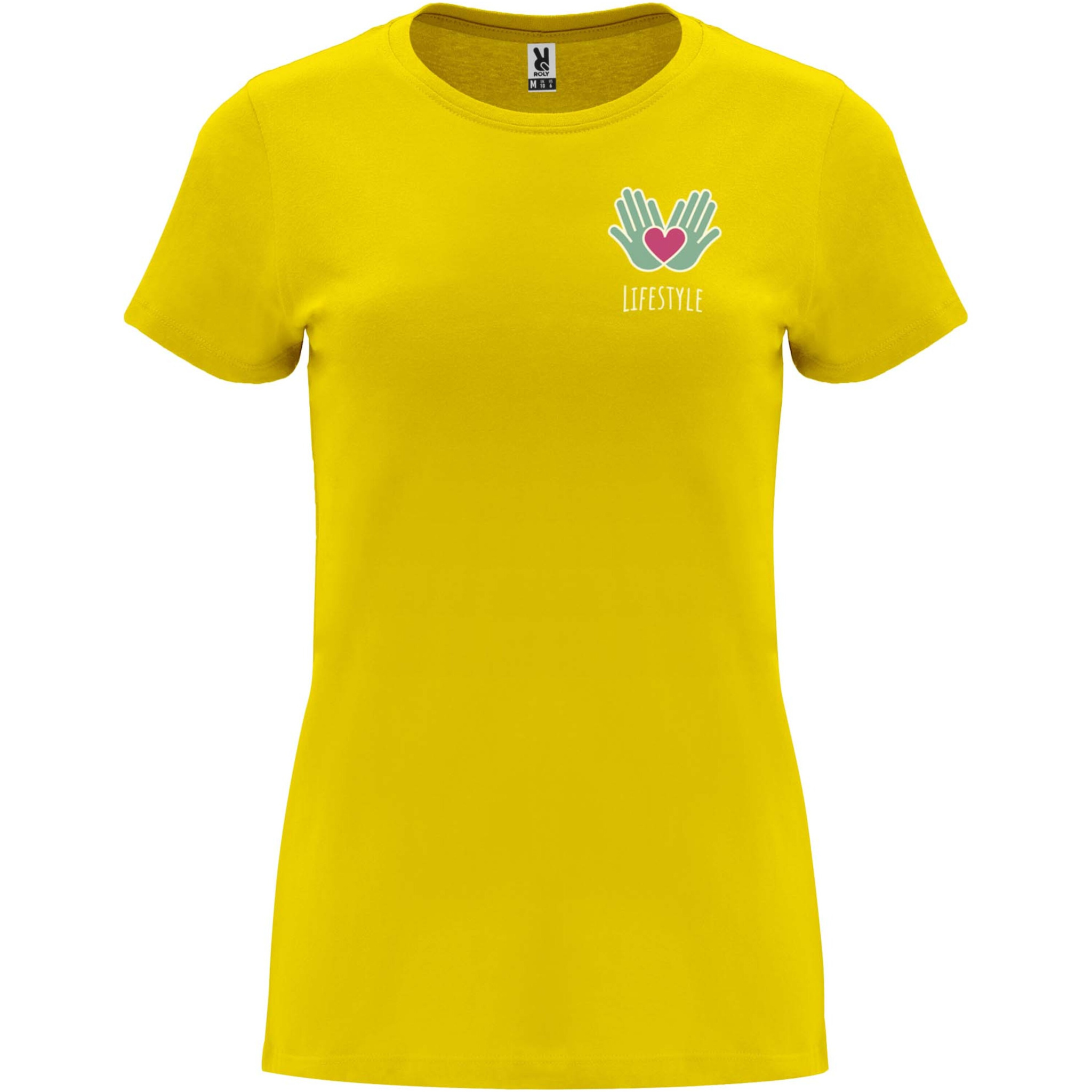Lyhythihainen ja muotoiltu naisten t-paita. 1x1 resorikankainen pyöreä kaula-aukko. Vahvistettu sauma pääntiessä. Irrotettava tuotemerkki.