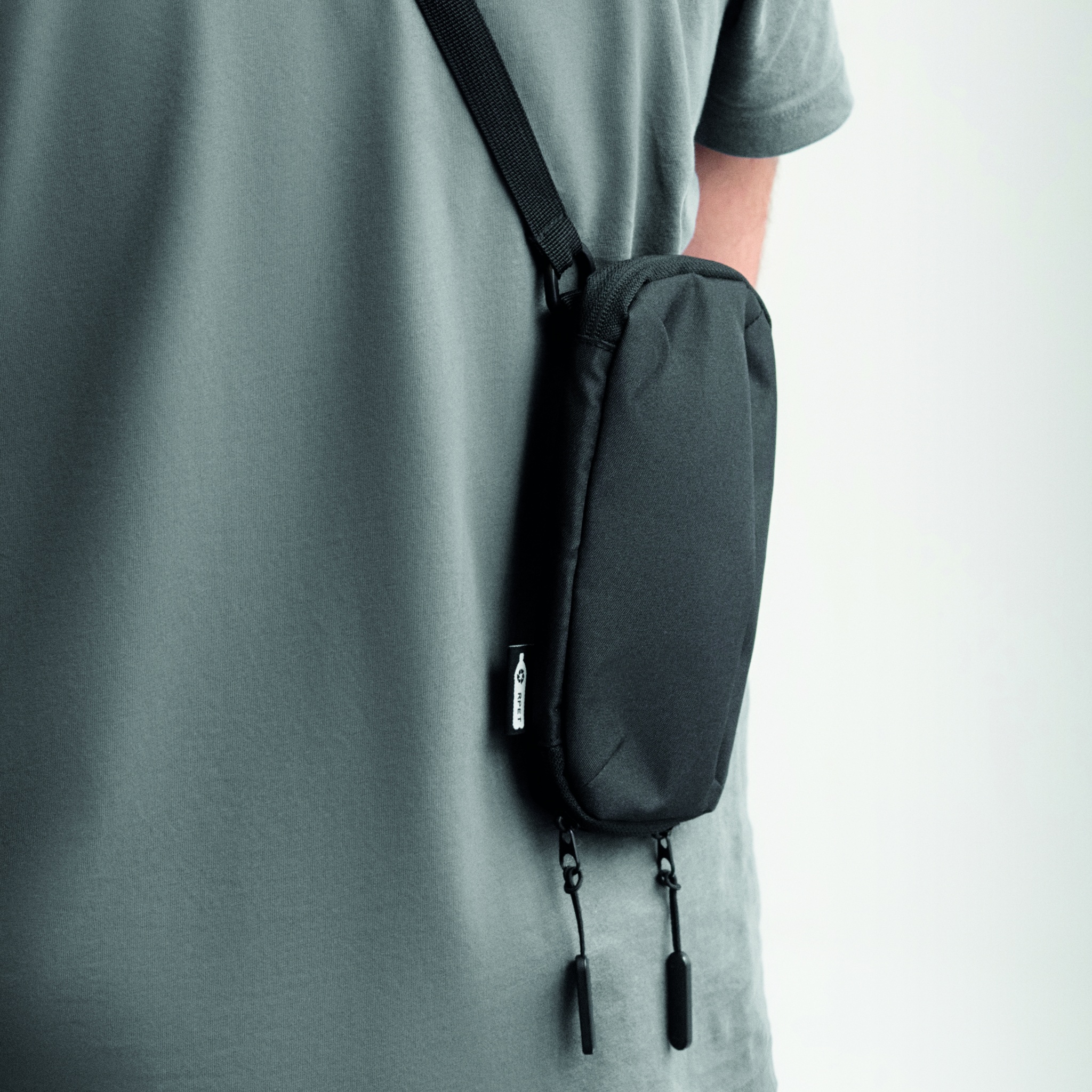 Yliolanlaukku puhelimelle 300D RPET polyesteristä, säädettävällä hihnall. Vetoketjullinen etu- ja sivutasku. sekä useita muita taskuja.
