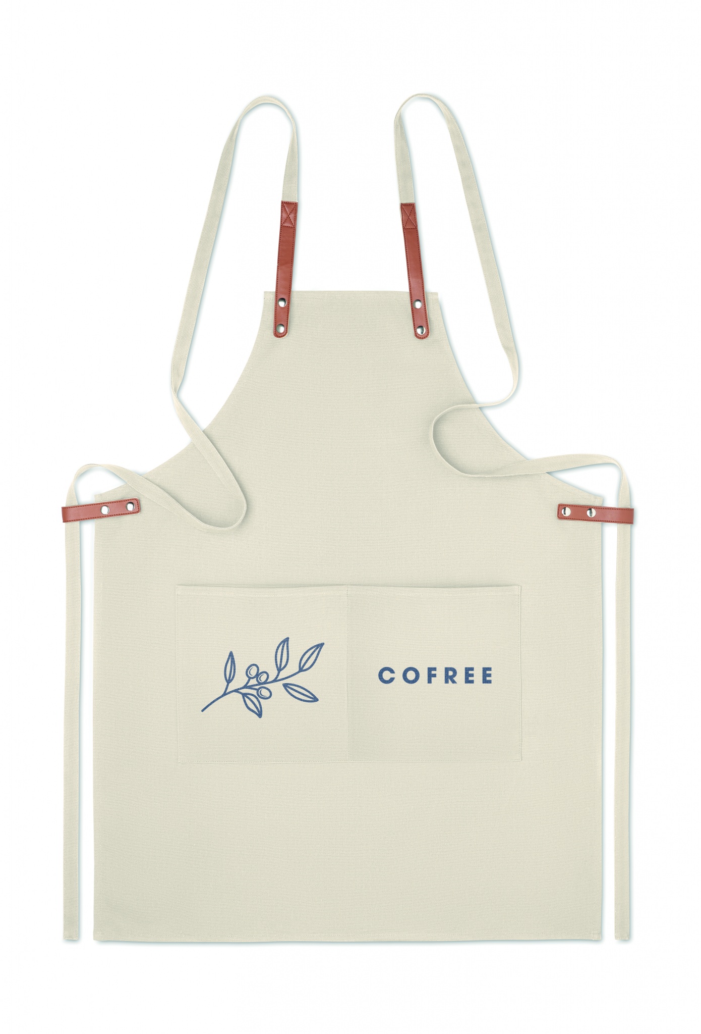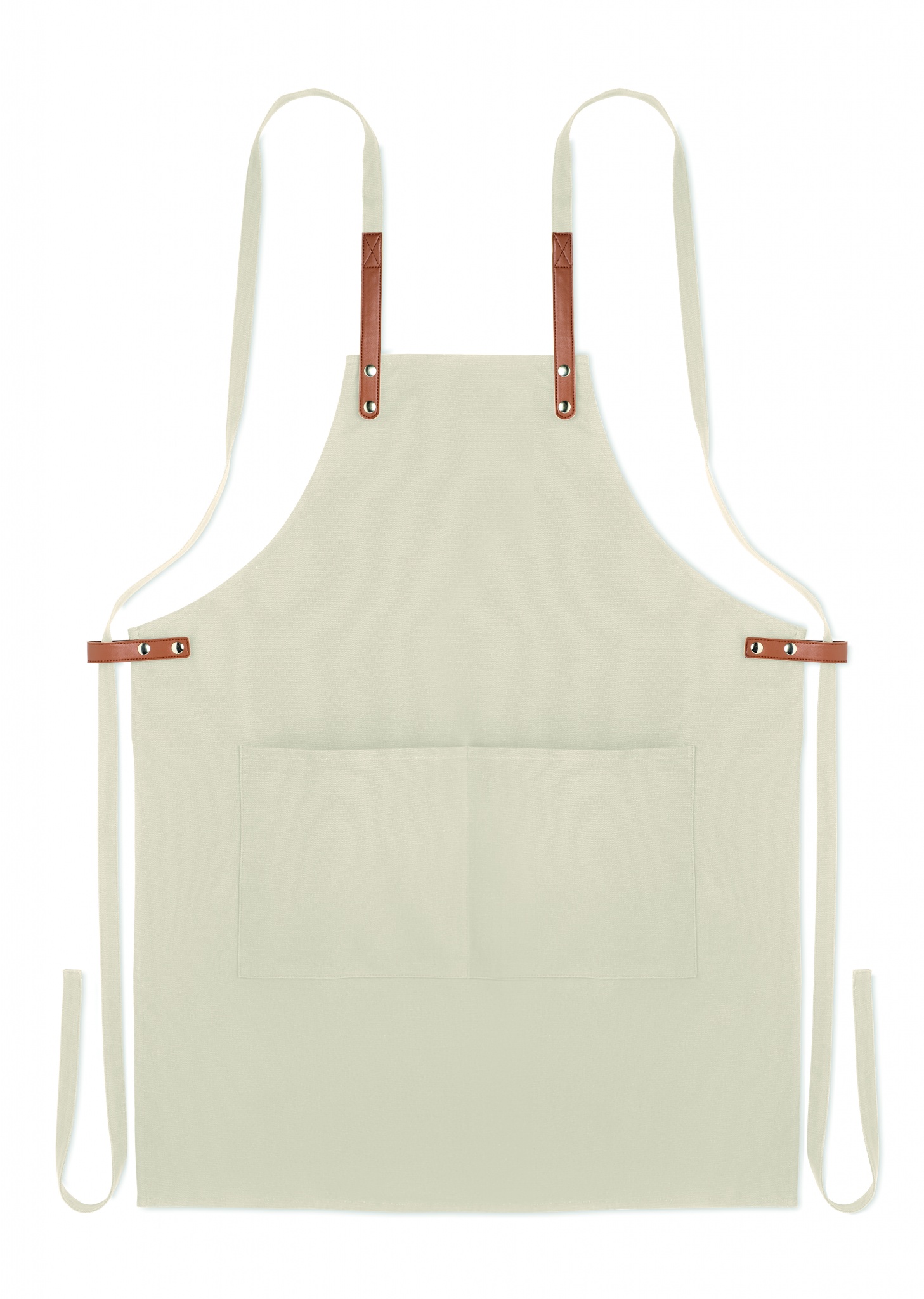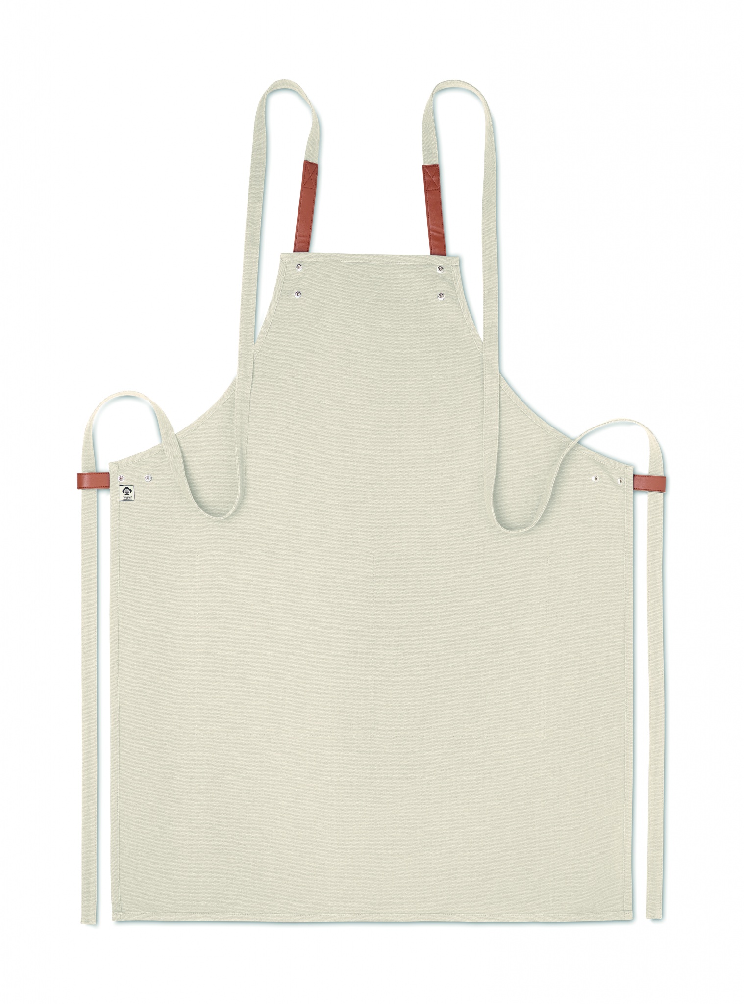 Säädettävä ja 2 etutaskulla varustettu 340 gr/m² orgaanisesta puuvillasta valmistettu esiliina.