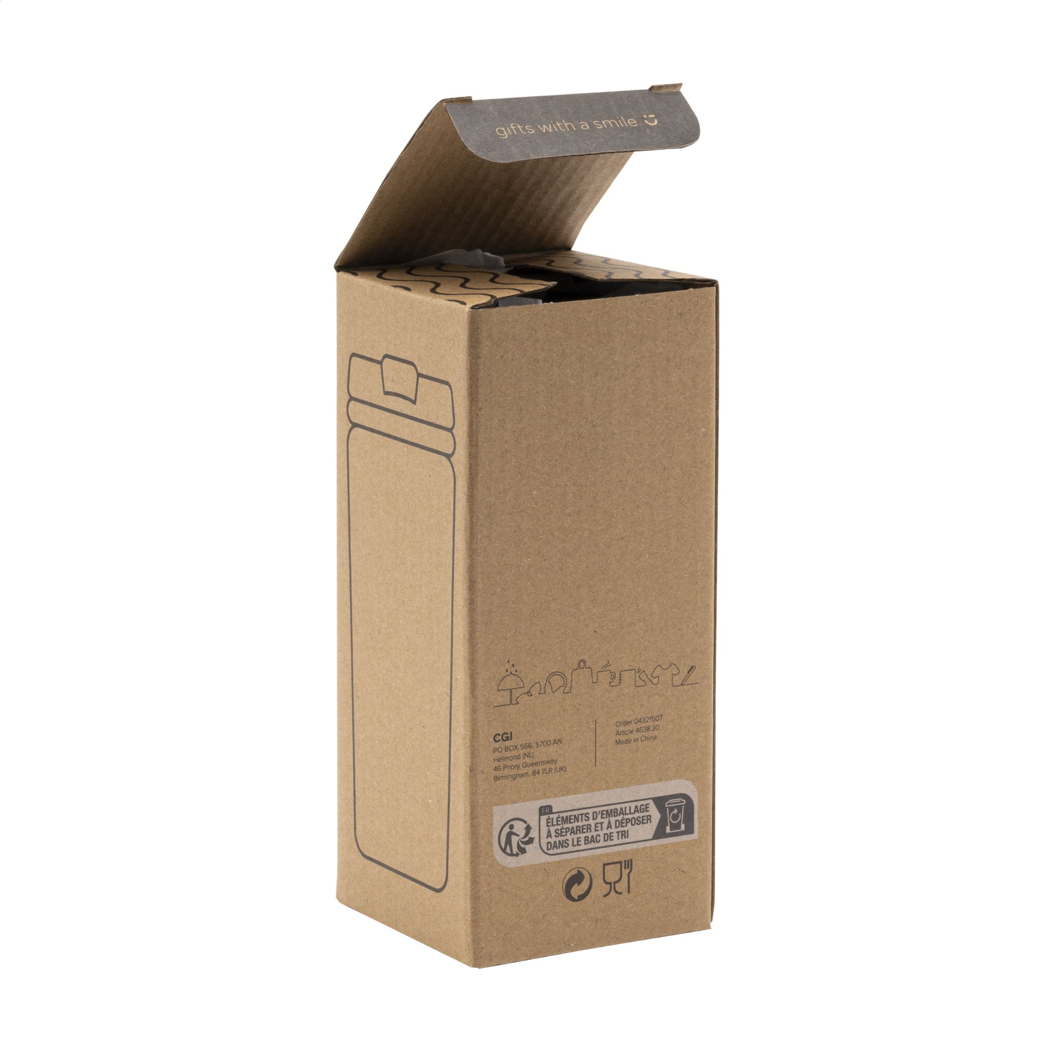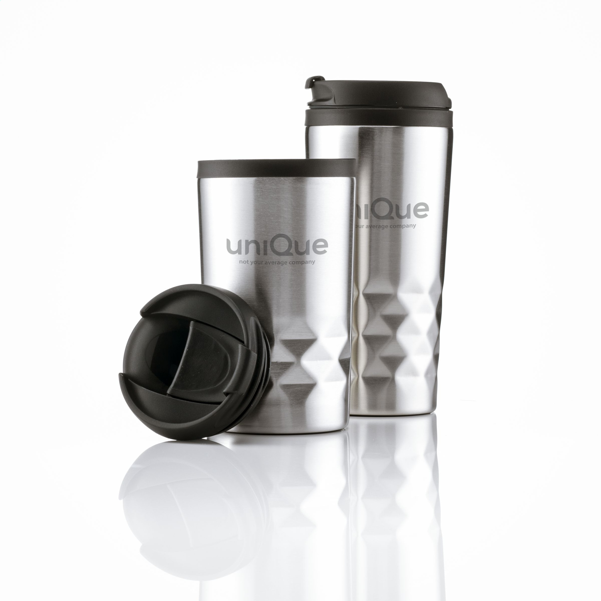 Kaksiseinäinen, vuotamaton ruostumattomasta teräksestä valmistettu termokuppi kierrekorkilla, napsautusaukko. PP sisäseinä. Telineessä erottuva geometrinen 3D-timanttikuvio. Liukumaton pohja. Tilavuus 300 ml. Jokainen tuote on pakattu erikseen.
