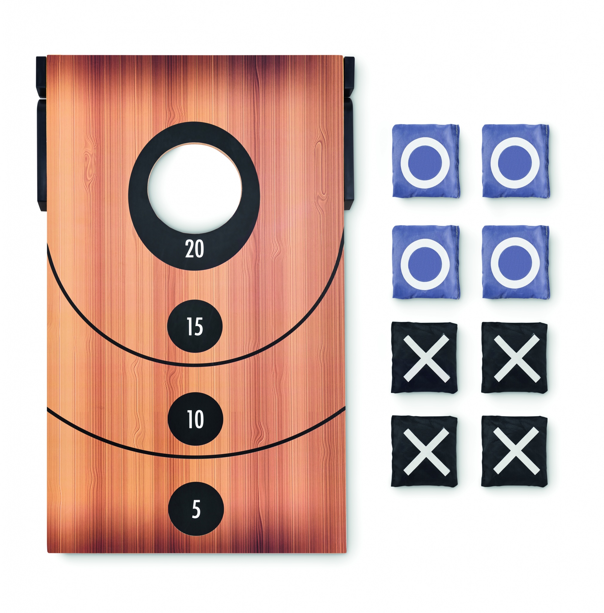 Kaksi puoleinen heittopeli/ tic-tac-toe, sisältää MDF laudan ja 8 heittosäkkiä. Peli, joka tunnetaan yleisesti nimellä Cornhole, on peräisin Pohjois-Amerikasta. Tavoitteena on heittää pienet hiekkasäkit reikään, joka kerta kun säkki menee sisään, ansaitset pisteitä. Henkilö, jolla on eniten pisteitä lopussa tai joka saavuttaa ensimmäisenä tietyn pistemäärän, voittaa. Käännä lauta ympäri pelataksesi klassista tic-tac-toe peliä.