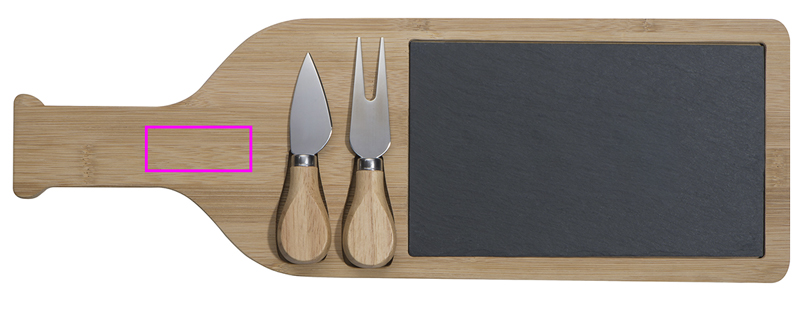Bambusta valmistettu juustolevy viinipullon muodossa, jossa on liuskekiveä, juustoveitsi ja juustohaarukka. Kaiverrustamme logosi liuskekiveen.