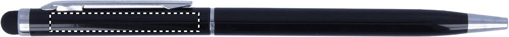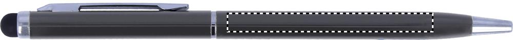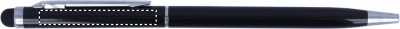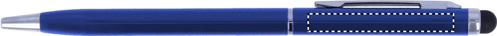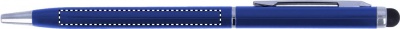 Twist action alumiininen kuulakärkikynä sinisellä musteella, kosketusnäyttöpäällä ja kiiltävillä kromi yksityiskohdilla.