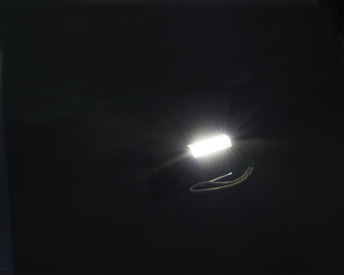 Ladattava alumiininen taskulamppu (400 mAh) mustassa laatikossa, mukana USB-C-latauskaapeli. Taskulampussa on COB-valo säädettävällä valokeilalla ja COB-valo varressa. Logosi painetaan laatikon kannen keskelle.